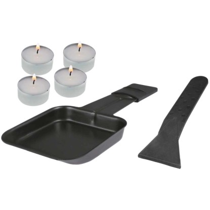 Das Gerät funktioniert ohne Strom mit vier Rechaud-Kerzen, die im Lieferumfang enthalten sind. Ein antihaftbeschichtetes Raclette-Pfännchen aus robustem Stahl und ein Kunststoffspachtel werden ebenfalls mitgeliefert. Dank der hochwertigen Verarbeitung und der robusten Materialien ist das Mini-Raclette sehr reinigungsfreundlich.