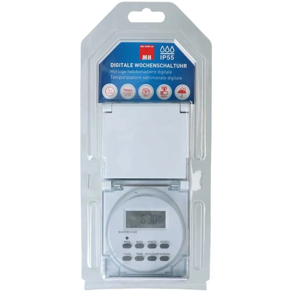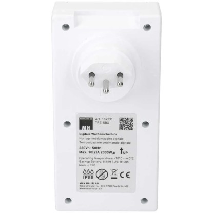 Cette minuterie numérique pour l'extérieur ou pour les environnements très sollicités permet d'allumer et d'éteindre automatiquement les appareils connectés. Grâce à une mémoire interne, il est possible d'enregistrer jusqu'à 20 heures de commutation marche / arrêt qui peuvent être soit regroupées en blocs journaliers dans les modèles hebdomadaires, soit varier pour chaque jour de la semaine. Afin de dissuader les intrus pendant une absence prolongée, le générateur aléatoire intégré permet par exemple d'allumer et d'éteindre l'éclairage à différents moments (simulation de présence). L'indice de protection IP55 comprend une protection complète contre la poussière et les contacts (IP5X) ainsi qu'une protection contre les jets d'eau (IPX5). Ceci est garanti lorsque la fiche IP55 est branchée ainsi que lorsque le couvercle rabattable est fermé. La protection anti-contact intégrée permet d'augmenter la sécurité.