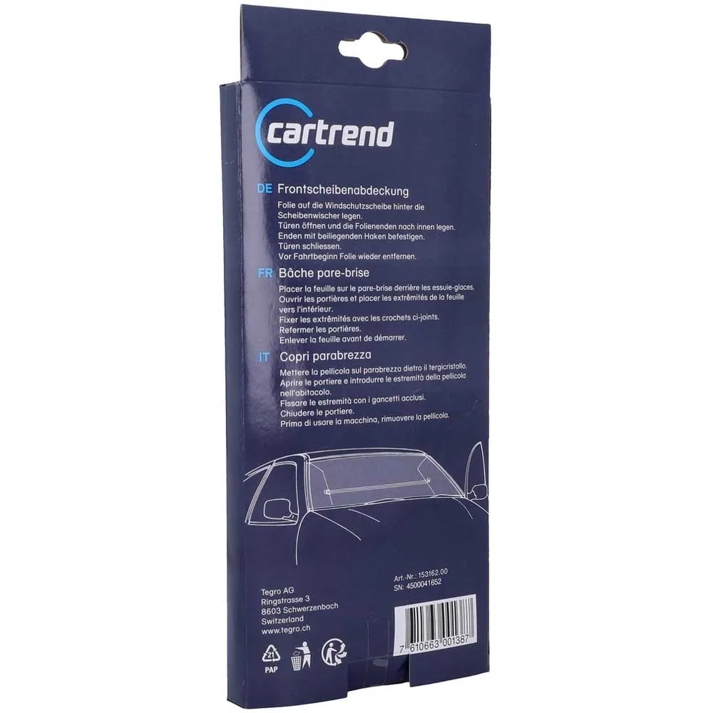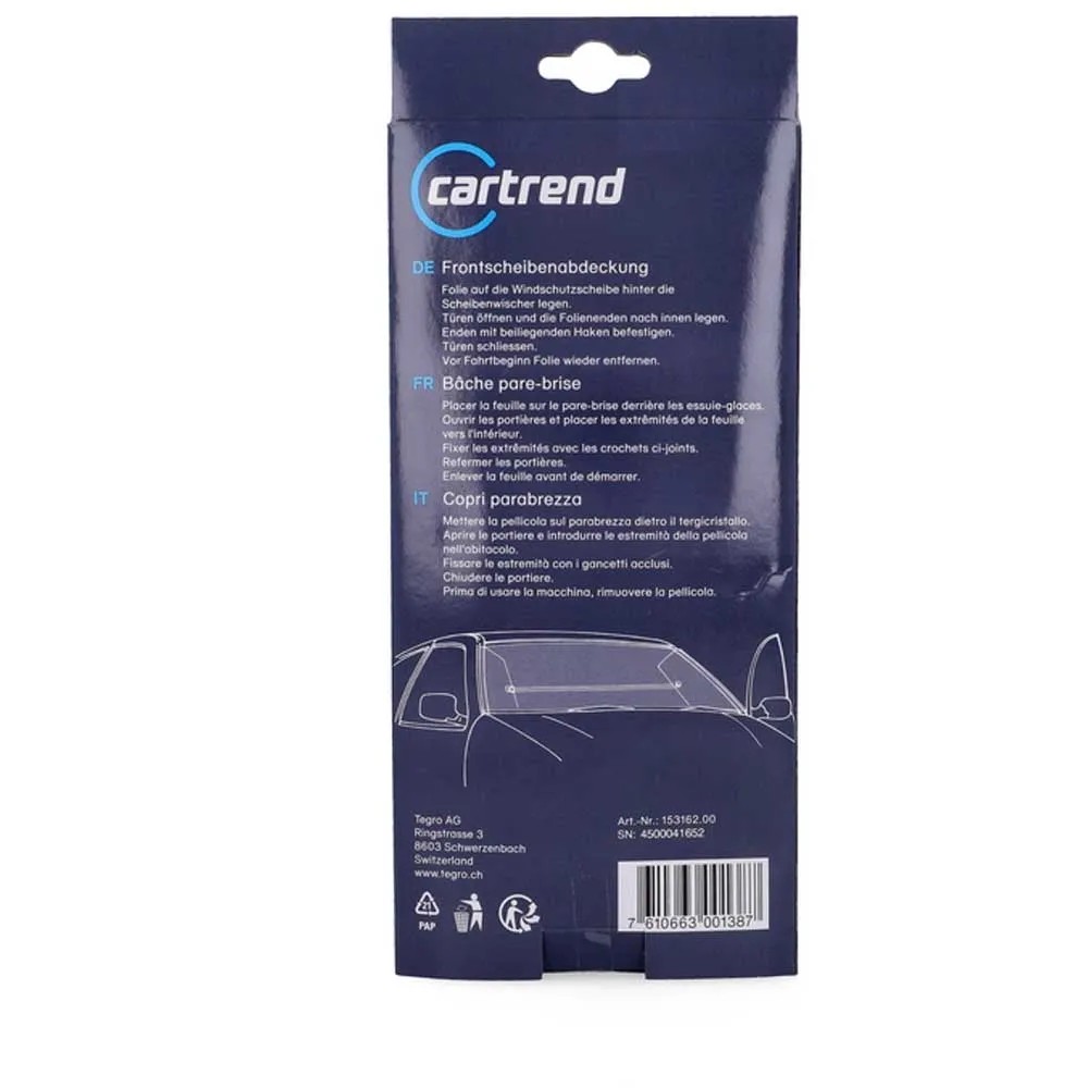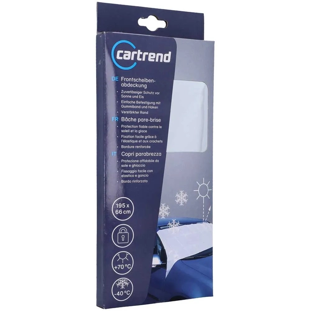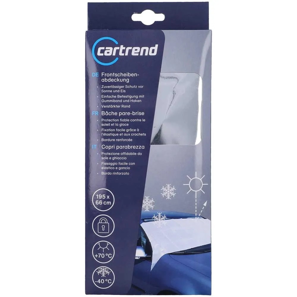 Die Cartrend Frontscheibenabdeckung bietet eine optimale Wetterschutzfunktion, egal ob bei Vereisung oder Hitze. Der Frontscheibenschutz wirkt hochisolierend. Dank der reissfesten Randverstärkung ist der Klima-Frontscheiben-Schutz sehr einfach in der Befestigung. Der Schutz von Cartrend ist silbern und im Format 195 x 66 cm erhältlich.