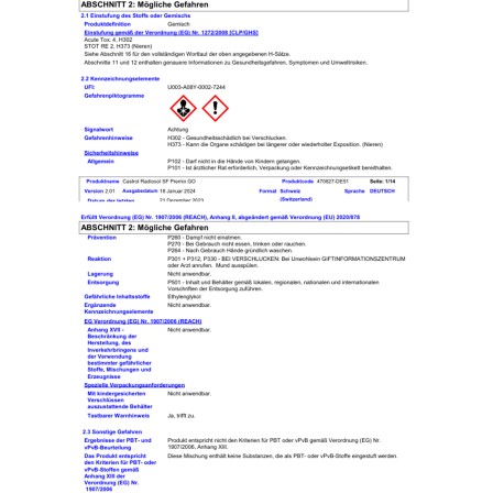 Castrol Radicool SF Premix Go ist ein gebrauchsfertiger Kühlerfrostschutz auf Basis von Monoethylenglykol und OAT-Inhibitortechnologie. Er schützt das Kühlsystem Ihres Fahrzeugs zuverlässig vor Korrosion, Überhitzung und Frostschäden bis -37 °C. Zusätzlich beugt die spezielle Formel der Bildung von Kalkablagerungen vor. Sie verhindert so das Verstopfen des Kühlers, was einen störungsfreien und effizienten Kühlmittelfluss gewährleistet. Durch seine guten Wärmeübertragungseigenschaften trägt das Produkt dazu bei, dass der Motor stets im optimalen Temperaturbereich arbeitet. Eine Verdünnung ist nicht erforderlich, das Produkt kann direkt verwendet werden. Das Kühlmittel eignet sich ideal für Fahrzeuge, die einen Kühlerfrostschutz mit OAT-Technologie benötigen.