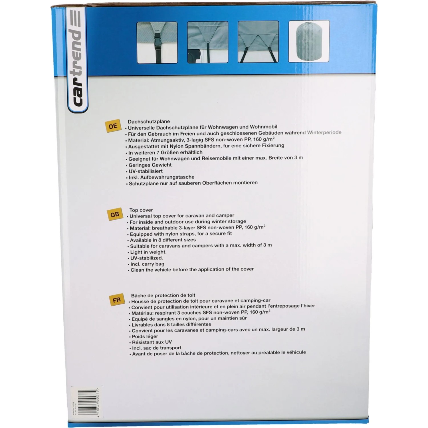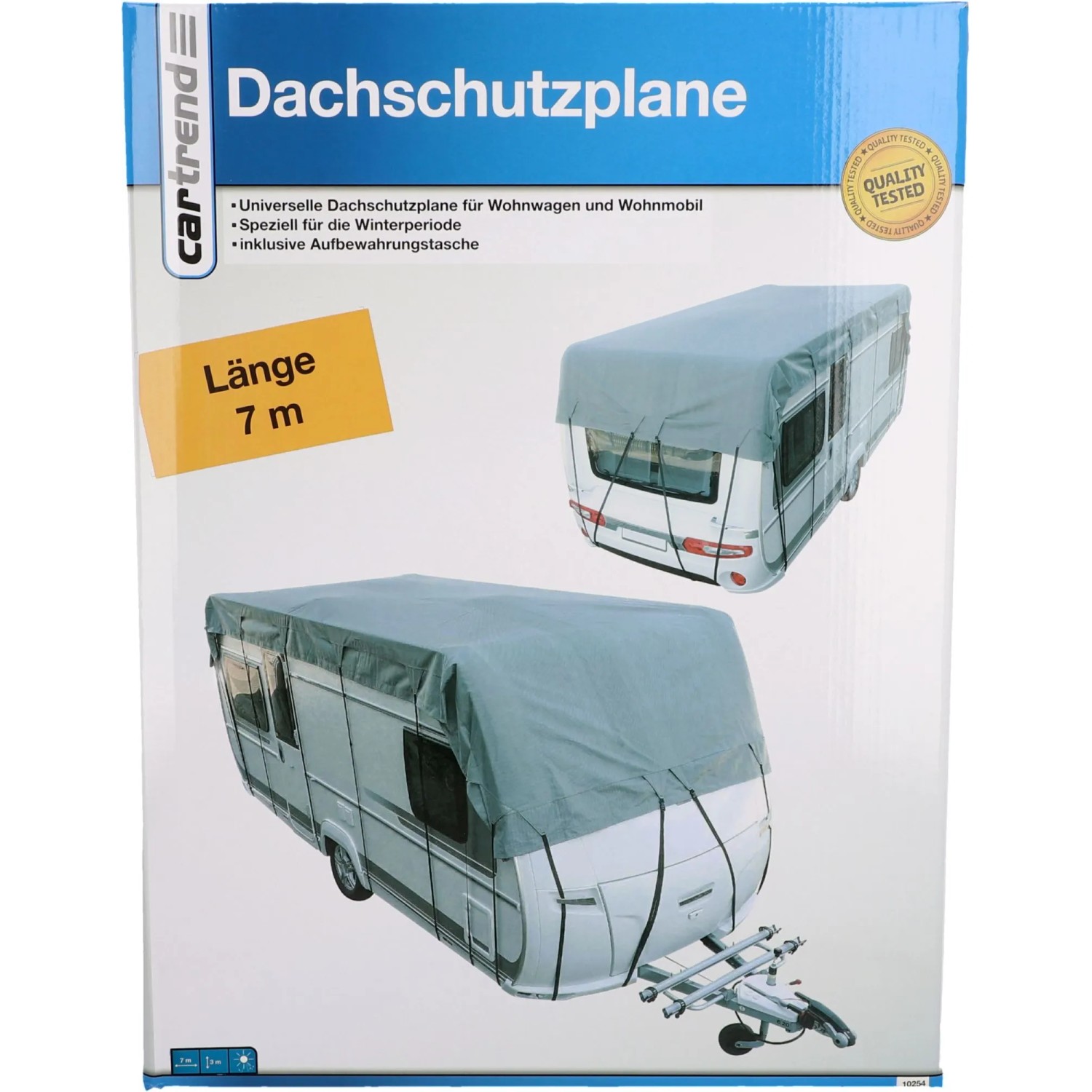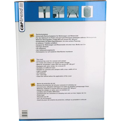 Die Dachschutzplane Grau 3 x 7 m von Cartrend ist eine universelle Dachschutzplane für Wohnwagen und Reisemobile. Sie eignet sich für den Gebrauch im Freien als auch in geschlossenen Gebäuden während der Winterperiode. Sie ist für Wohnwagen und Reisemobile mit einer max. Breite von 300 cm geeignet. Die Dachschutzplane hat ein geringes Gewicht und ist UV-beständig. Sie ist aus atmungsaktiven, 3-lagigen SFS non-woven PP gefertigt und ist mit Nylon-Spannbändern für eine sichere Fixierung ausgestattet. Ihre Masse sind 3 x 7 m. Eine Aufbewahrungstasche ist im Lieferumfang enthalten.