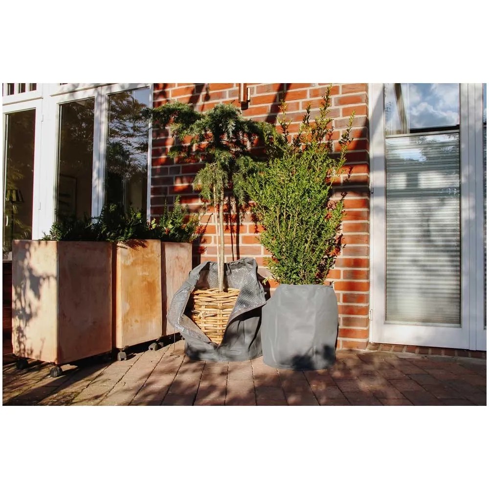 Durch die Isolation des Thermo-Topfschutzes Ice wird das Wurzelwerk von Kübelpflanzen rundum vor Frost geschützt. Der moderne Frostschutz-Übertopf mit stabilem Vlies aussen und Luftpolsterfolie innen bietet zu allen Seiten eine gute Dämmwirkung. Eine dicke Hart-Styroporplatte mit Drainagelöchern isoliert zudem nach unten und schützt die Pflanze gegen aufsteigenden Bodenfrost. Der obere Rand des Thermo-Topfschutzes Ice kann mit einem breiten, angenähten Wintervlies-Kragen verschlossen werden, der mit einer Zugkordel gerafft wird. Dieser obere Abschluss vermindert die Austrocknung des Wurzelballens. Zum Giessen kann diese Wintervlieskrempe mit der Zugkordel einfach gelöst und wieder verschlossen werden.