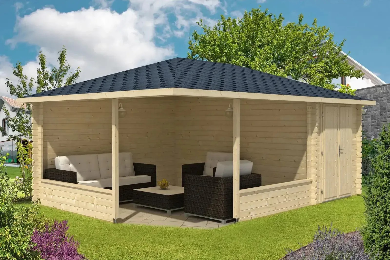 Mit einer Nutzfläche von 12,5 m² kann der Holzpavillon vielfältig genutzt werden. Mit einer Gartenlounge entsteht ein gemütlicher Rückzugsort zum Entspannen und Verweilen. Weiterhin eignet sich die Gartenhütte hervorragend als Poolhaus und bietet Ihnen einen praktischen Unterschlupf. Auch als Grillpavillon für gesellige Abende unabhängig des Wetters macht die Gartenlaube einiges her. Im angrenzenden Geräteschuppen mit einer Nutzfläche von 6,51 m² können Sie Poolzubehör, Gartenauflagen, Grillzubehör und andere Utensilien geschützt verstauen.Gartenpavillon in natürlicher Optik
