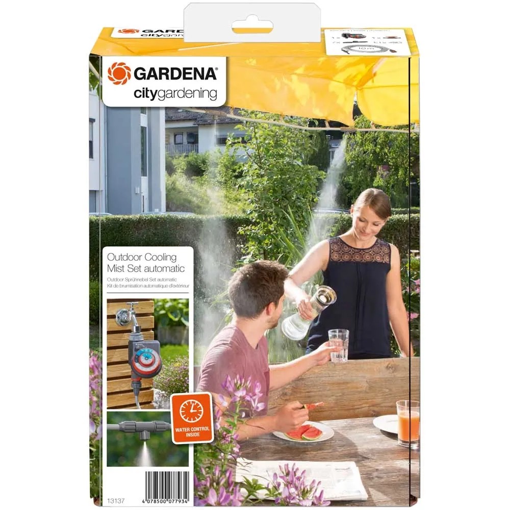 Erfrischung an heissen Sommertagen. Mit dem Gardena City Gardening Outdoor-Sprühnebel-Set Automatic bleibt es auf Terrasse und Balkon, im Zelt oder unter dem Sonnenschirm auch an heissen Sommertagen kühl und angenehm. Dank der EasyPlus-Bewässerungssteuerung, lässt sich die Nutzungsdauer des Luftkühlersets individuell einstellen.