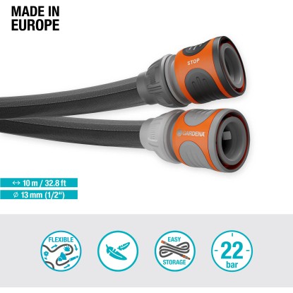Der Textilschlauch Liano™ Life von Gardena ist ideal für Bewässerungen von kurzer und mittlerer Dauer in kleinen Gärten. Er ist als verlässlicher Allrounder schnell zur Hand. Durch die vormontierten original Gardena Systemteile, den Liano™ Schlauchverbinder und den Liano™ Wasserstopp, ist der Schlauch mit einem Durchmesser von 13 mm (1/2") schnell einsatzbereit. Für eine optimale Performance und Langlebigkeit sorgen der flexible PVC-Innenschlauch und der Aussenschlauch aus widerstandsfähigem Textilgewebe. Der Liano™ Life überzeugt mit seiner herausragenden Flexibilität, die während der Bewässerung des Gartens oder beim Reinigen ums Haus helfen wird. Er ist bis zu 50 % leichter als herkömmliche PVC-Schläuche und dadurch auch über längere Zeiträume hinweg bequem in den Händen zu tragen. Die angenehme Haptik ermöglicht eine komfortable Handhabung. Seine ausgezeichnete Elastizität vereinfacht die Bewegung und das Ziehen des Schlauchs über den Boden deutlich. Er bleibt weniger an Hindernissen hängen und verknickt nicht. Dies erleichtert ausserdem das Verstauen, da sich der Liano™ Life einfach und kompakt an den vorhandenen Stauraum anpasst. Der Gartenschlauch hat einen Berstdruck von 22 bar. Dank UV- und Frostschutz kann er ganzjährig im Freien aufbewahrt werden. Der Liano™ Life ist schadstofffrei und daher frei von Phthalaten (0,1 %) sowie frei von Cadmium, Blei und Barium (0,1 %). Der Textilschlauch Liano™ Life ist ein Qualitätsprodukt Made in Europe.