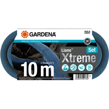 Für die tägliche Bewässerung ist das Gartenschlauch-Set Liano™ Xtreme von Gardena ideal. Mit einer Länge von 10 m ist der robuste Textilschlauch mit einem Durchmesser von 13 mm (1/2") für die anspruchsvolle Bewässerung in kleinen Gärten, auf dem Balkon oder der Terrasse geeignet. Neben dem Liano™ Xtreme besteht das sofort einsatzbereite Set aus den vormontierten original Gardena Systemteilen, dem Liano™ Wasserstopp und dem Liano™ Schlauchverbinder, zwei Hahnverbindern und einer Bewässerungsbrause. Das Reduzierstück in einem der beiden Hahnverbinder sorgt dafür, dass der Liano™ Xtreme an insgesamt drei Hahngrössen angeschlossen werden kann. Die enorme Widerstandskraft und Flexibilität des Textilschlauchs zeigt sich bei herausforderndem Gelände wie Pflastersteinen, Rosendornen oder entlang von Hauswänden. Der Liano™ Xtreme ist schmutzabweisend, verknickt nicht und kann leicht um Hindernisse geführt werden. Seine ausgezeichnete Strapazierfähigkeit und Langlebigkeit resultieren aus dem sehr flexiblen PVC-Innenschlauch und der Verarbeitung des innovativen Aussenschlauchs aus extrem widerstandsfähigem Textilgewebe. Das Manövrieren des Textilschlauchs ist sehr leicht und in Kombination mit der angenehmen Haptik wird der Komfort noch gesteigert. Der Gartenschlauch ist bis zu 50 % leichter als herkömmliche PVC-Schläuche. So gehen längere Bewässerungen mühelos von der Hand. Dank seiner Elastizität ist der Liano™ Xtreme platzsparend aufzubewahren, da er sich dem zur Verfügung stehenden Stauraum anpasst. Er kann daher bequem ins Regal, in die Garage oder in den Keller gelegt werden. Ausserdem überzeugt er mit einem Berstdruck von 35 bar sowie mit seiner UV- und Frostbeständigkeit. Der schadstofffreie Textilschlauch ist frei von Phthalaten (0,1 %) sowie frei von Cadmium, Blei und Barium (0,1 %). Der Textilschlauch Liano™ Xtreme ist ein in Europa hergestelltes Qualitätsprodukt.