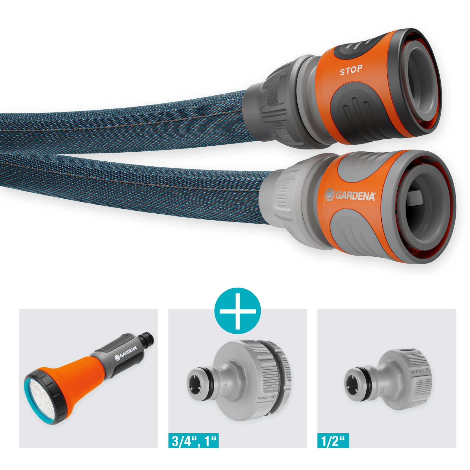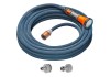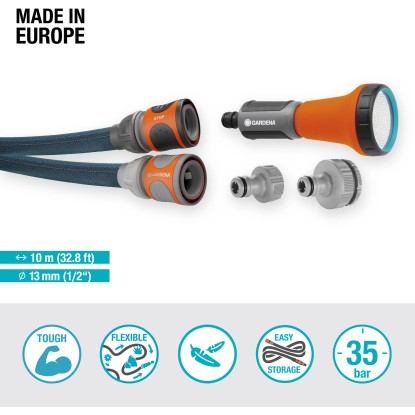 Im Set enthalten sind ein 10 m langer Textilschlauch mit einem Durchmesser von 13 mm (1/2"), eine Bewässerungsbrause, ein vormontierter Schlauchverbinder, ein vormontierter Wasserstopp und zwei Hahnverbinder (einer mit Reduzierstück).