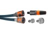 Im Set enthalten sind ein 25 m langer Textilschlauch mit einem Durchmesser von 13 mm (1/2"), eine Reinigungsspritze, ein vormontierter Schlauchverbinder, ein vormontierter Wasserstopp und zwei Hahnverbinder (einer mit Reduzierstück).