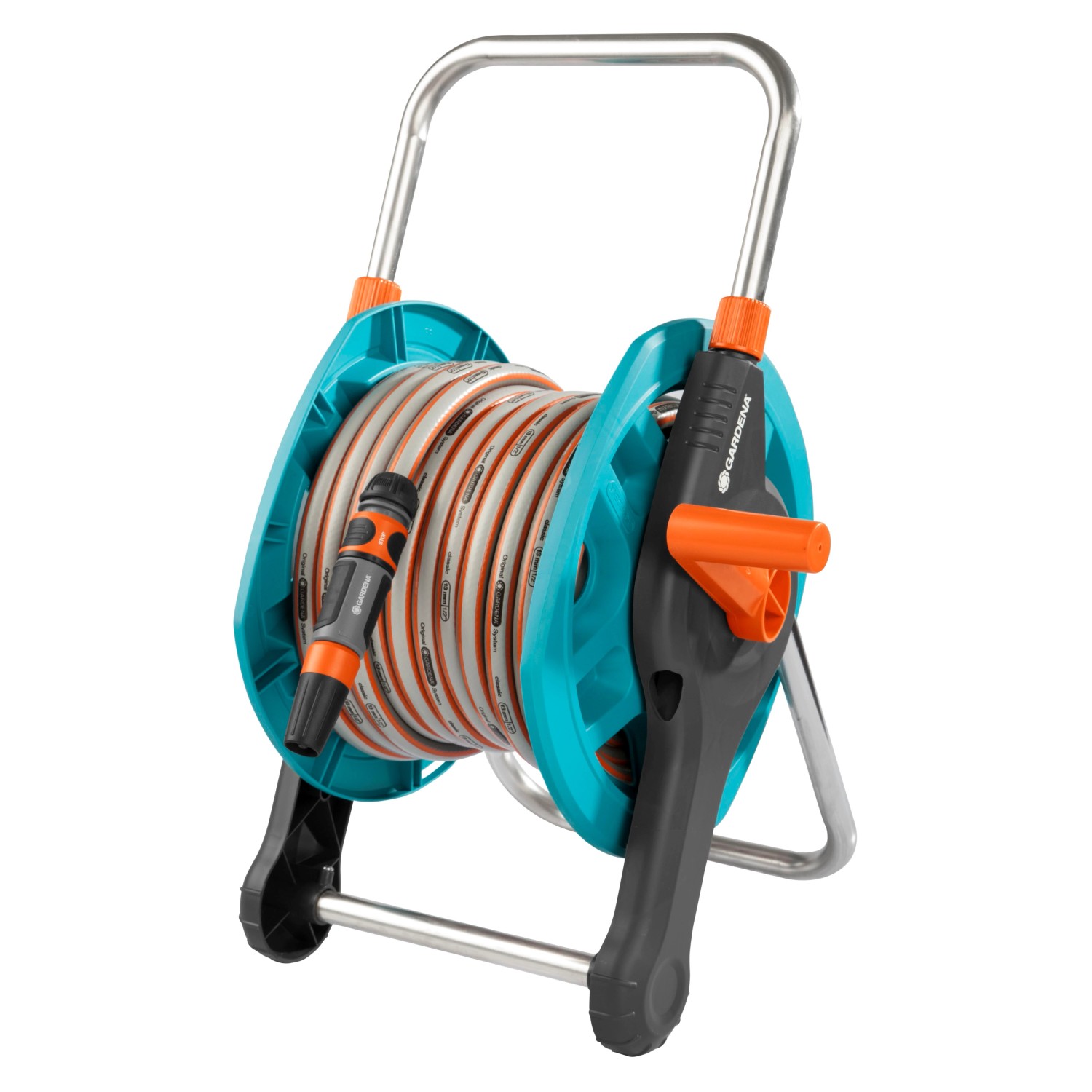 Das Gardena Schlauchträger-Set verfügt über einen höhenverstellbaren Griff mit speziellem Klappmechanismus. Der 20-m-Schlauch mit einem Durchmesser von 1/2" verfügt über eine Steck-Kupplung für 21 mm, 26,5 mm und 33,3 mm. Inkl. Schlauch und Adapter.