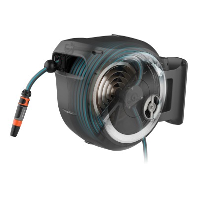 Mit kurzen Arretierstopps kann der Gartenschlauch auf die gewünschte Länge ausgezogen werden. Um den Schlauch wieder aufzurollen, reicht ein leichter Zug am Schlauchende. Die RollControl-Technologie bewirkt ein langsames und sicheres Einholen. Die integrierte Schlauchführung sorgt dafür, dass der Schlauch ordentlich und gleichmässig ohne Knicke oder Verknotungen aufgerollt wird.
