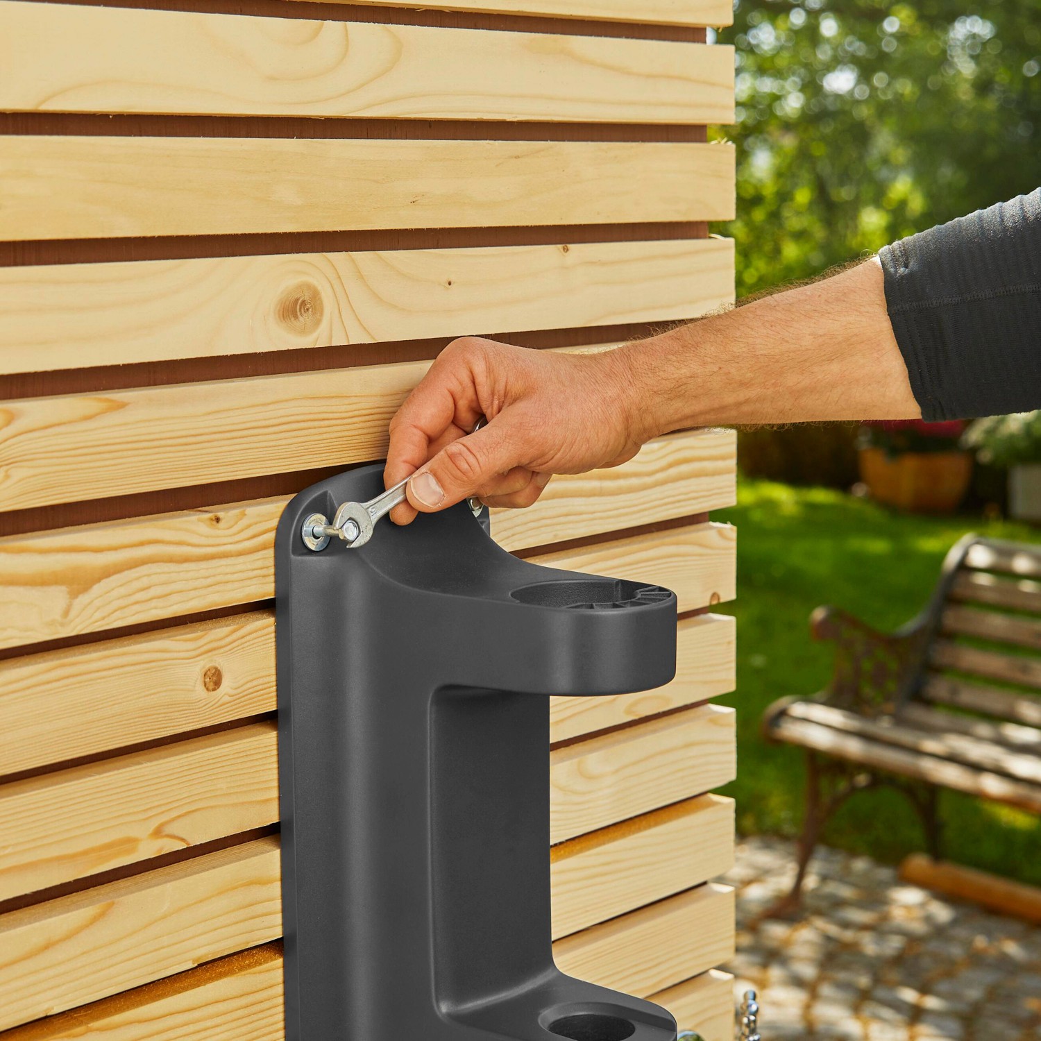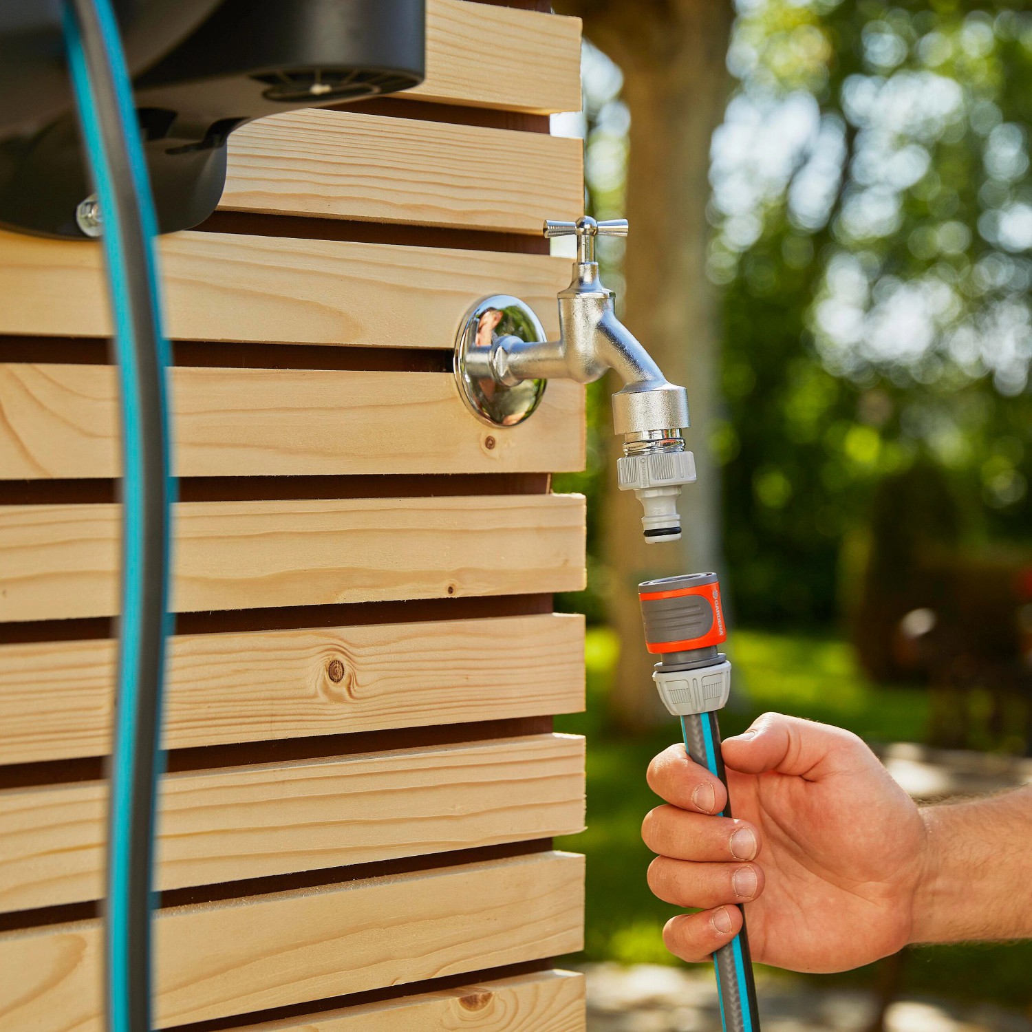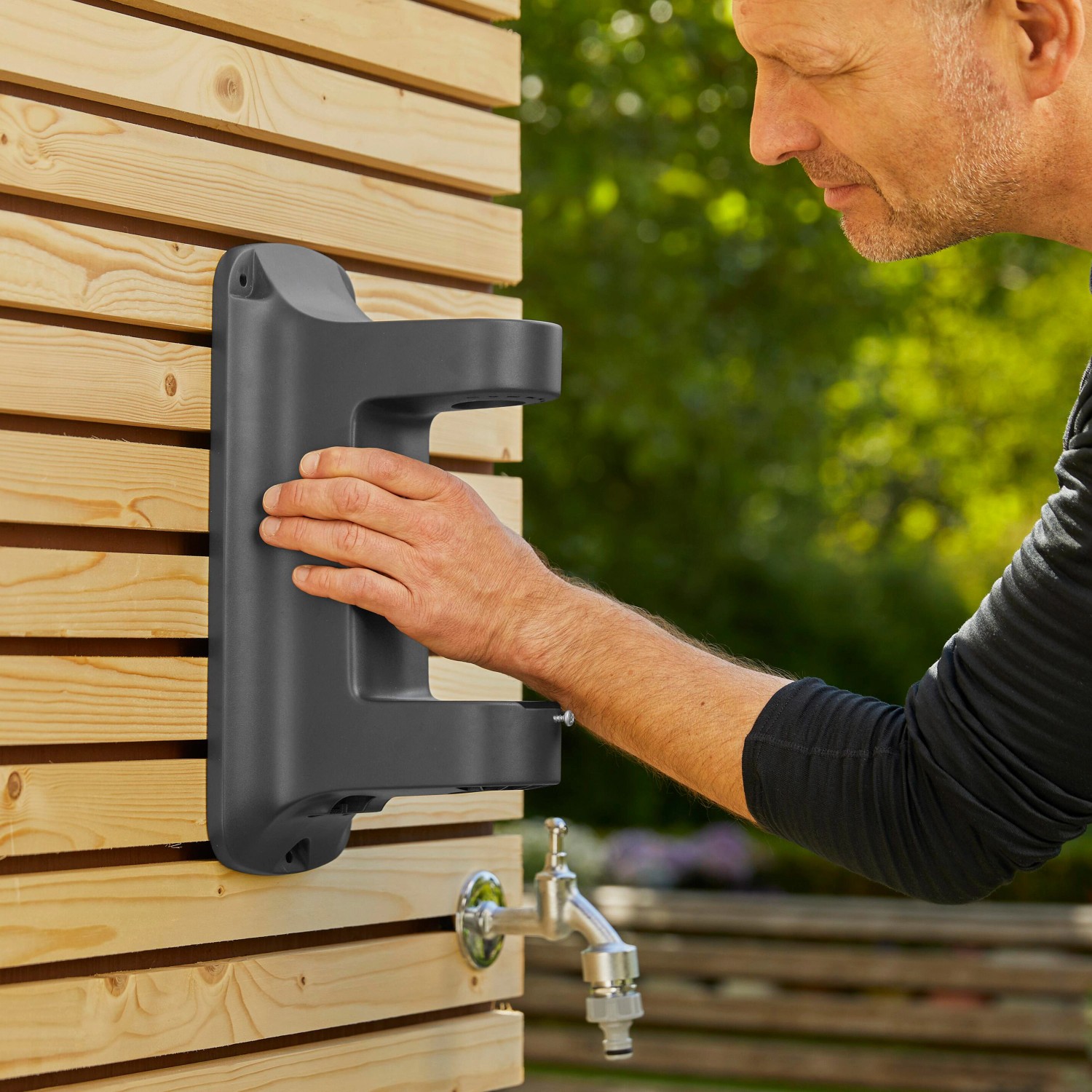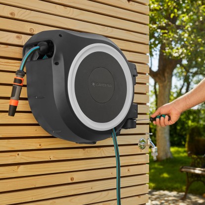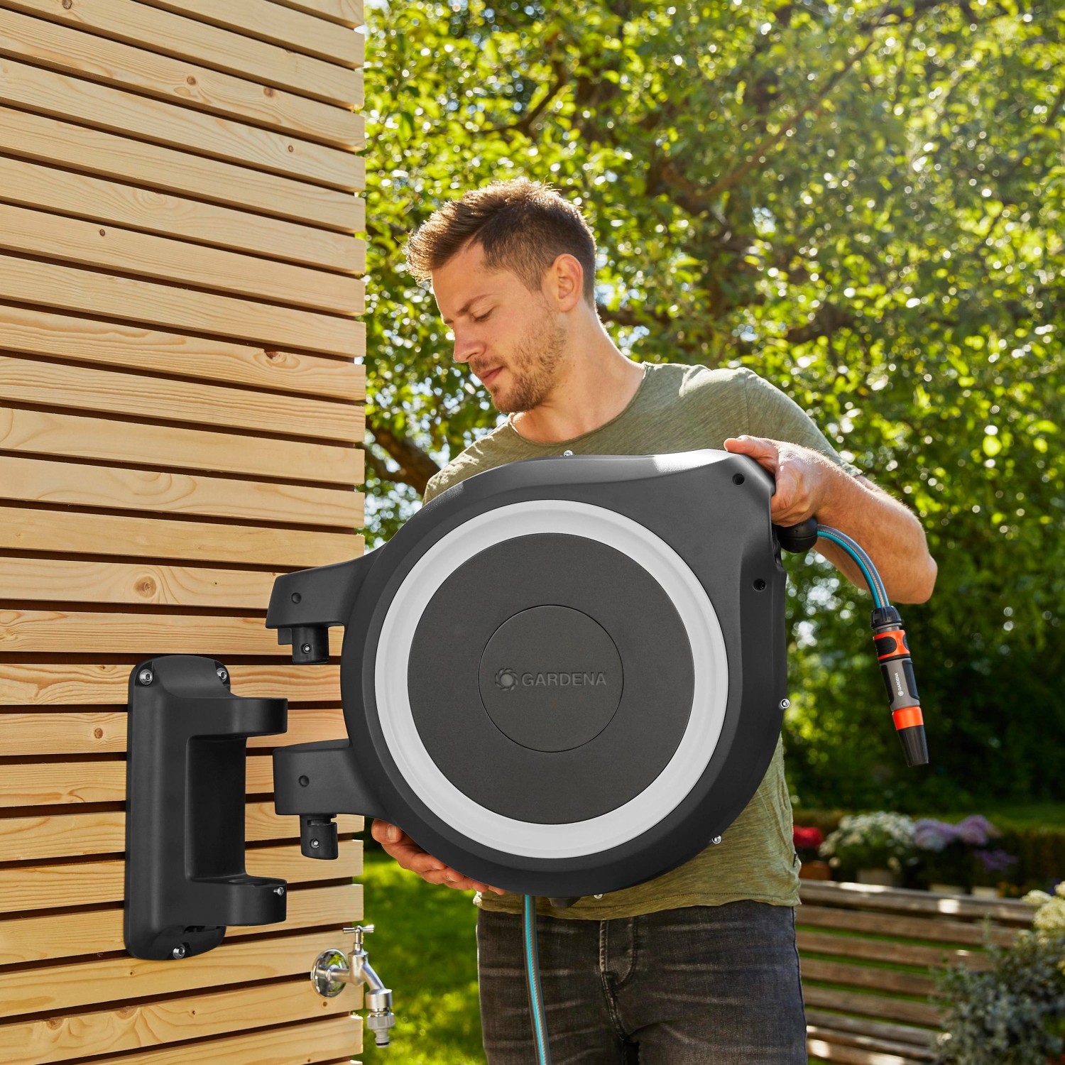 Die Wandhalterung ist um 180° schwenkbar. Dadurch bewässern Sie entspannt jeden Winkel Ihres Gartens, ohne dass der Schlauch abknickt. Die Hahn- und Schlauchanschlüsse der Schlauchbox sind Teil des Original Gardena Systems. Dadurch lassen sich auch andere Gardena Bewässerungsaufsätze anbringen. Die kompakte Schlauchaufbewahrung wird an der Hauswand montiert und mit einem Verbindungsschlauch am Wasserhahn angeschlossen.