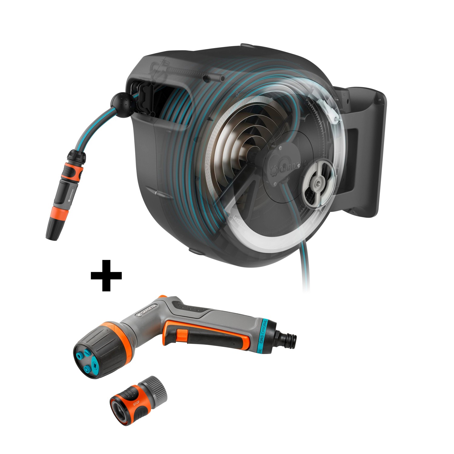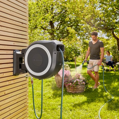 Mit der Gardena Wand-Schlauchbox XL mit Comfort Reinigungsspritze ecoPulse ist der Gartenschlauch sofort einsatzbereit. Der 35 m lange Schlauch und die um 180° schwenkbare Schlauchbox erleichtert das Bewässern des Gartens.