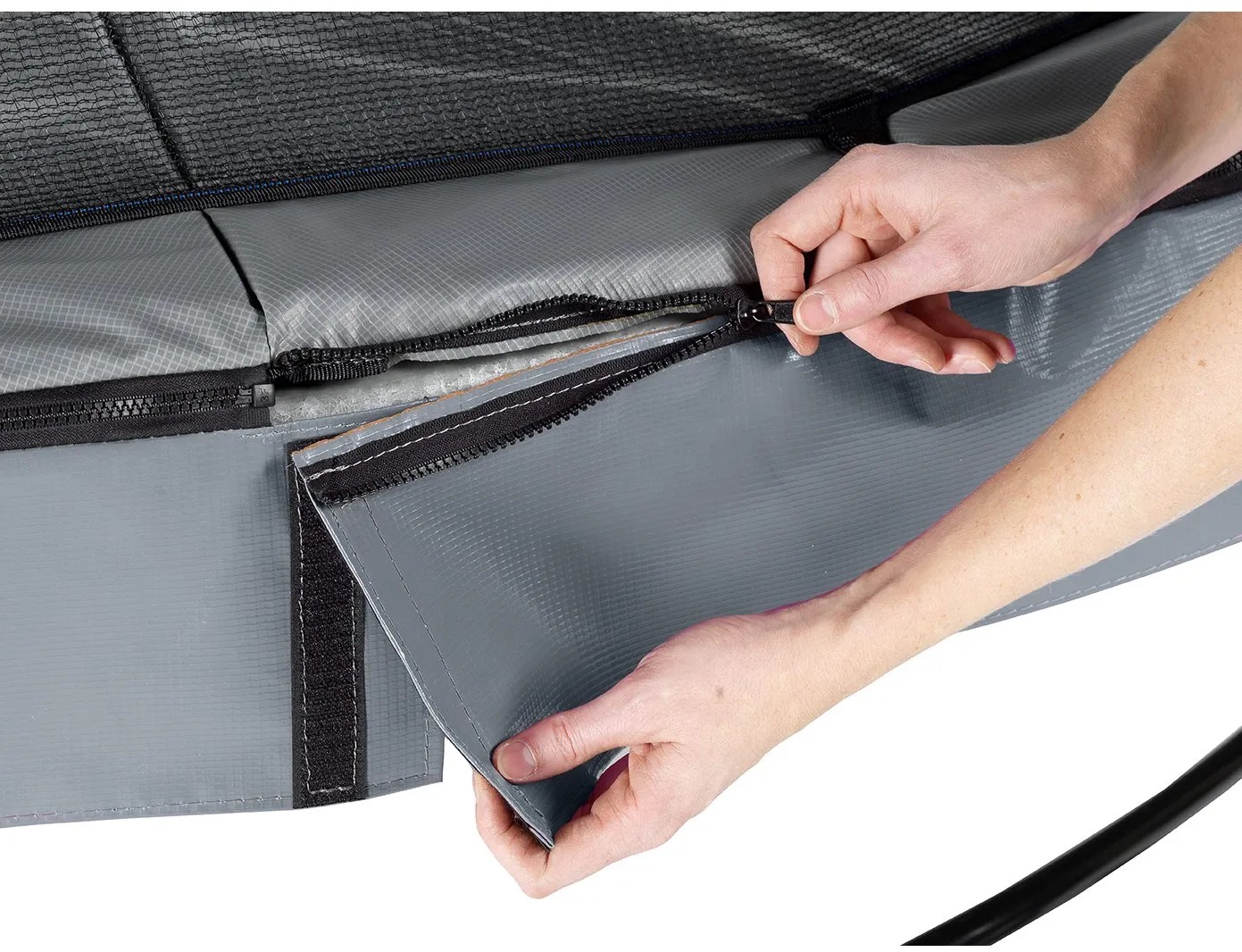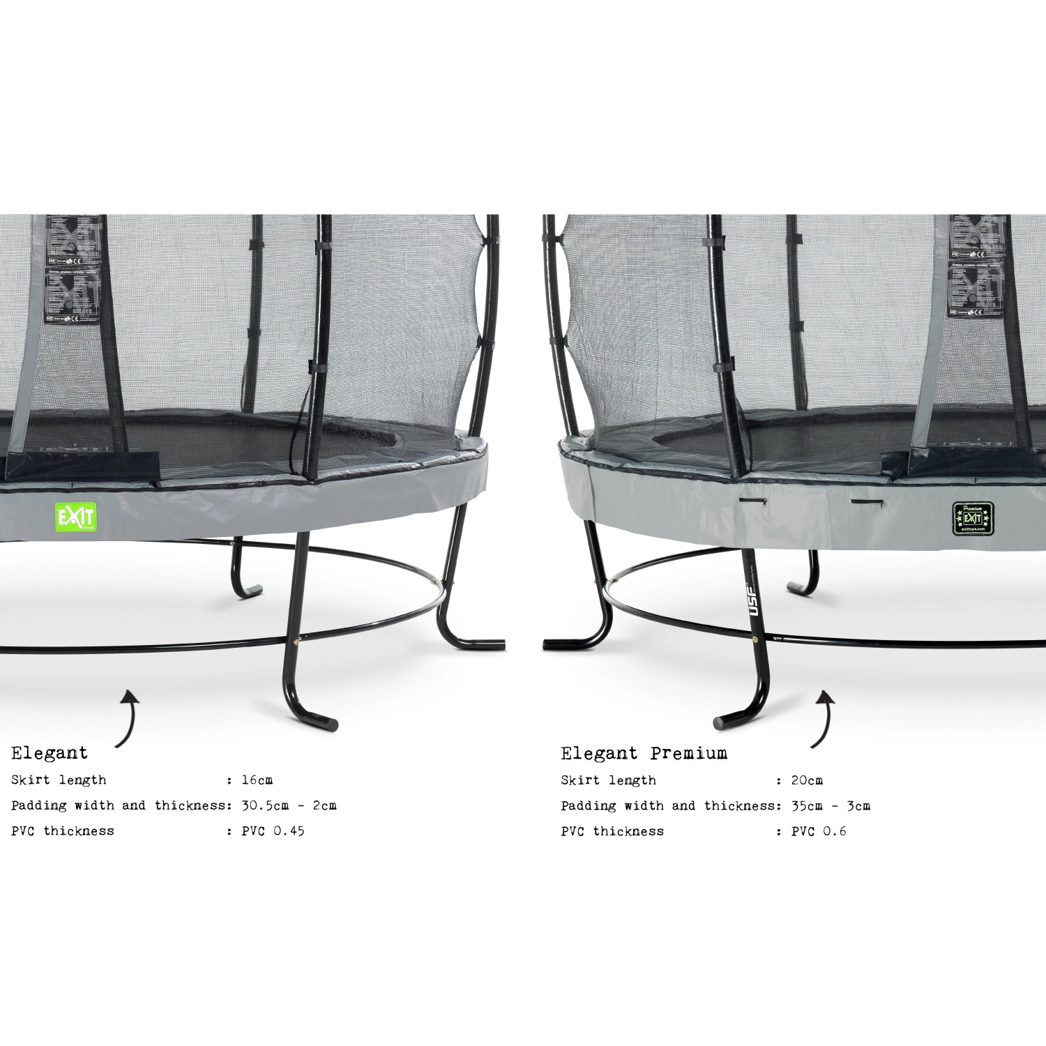 Der patentierte Ultimate-Stability-Frame (USF) mit seinen einmaligen L-förmigen Füssen ist unglaublich stark und dadurch supersicher und stabil. Zum Trampolin Elegant Premium von Exit wird standardmässig ein Deluxe-Sicherheitsnetz mit kinderfreundlichem Eingang durch die überlappende Tür mitgeliefert. Das Sicherheitsnetz ist hochwertig verarbeitet und hat extradicken Schaum rund um die Pfosten. Durch Glasfiberringe an der Ober- und Unterseite steht es rund gespannt. Das Trampolin Elegant Premium ist nicht nur schön, sondern auch noch langlebig. Der Rahmen ist galvanisiert und pulverbeschichtet, sodass Rost keine Chance hat. Im Vergleich zum Trampolin Standard Elegant hat es extralange Federn für das ultimative Sprungerlebnis und eine längere Schürze am Schutzrand für ein schöneres Erscheinungsbild. Ausserdem ist die Füllung für noch mehr Schutz dicker und die dickere PVC-Oberschicht sorgt für eine längere Lebensdauer. Dank des innovativen Befestigungssystems des Rahmens lässt sich das Trampolin viel einfacher montieren als andere Trampoline. Der Schutzrand ist stabil und mit dem von Exit Toys entwickelten Foot-Protection-System (FPS) ausgestattet, sodass Sie beim Trampolinspringen nie mehr mit dem Fuss zwischen die Federn kommen können. Das Trampolin Elegant Premium ist innerhalb von 1 h fertig für den Gebrauch, also worauf warten Sie noch? Lassen Sie uns springen!