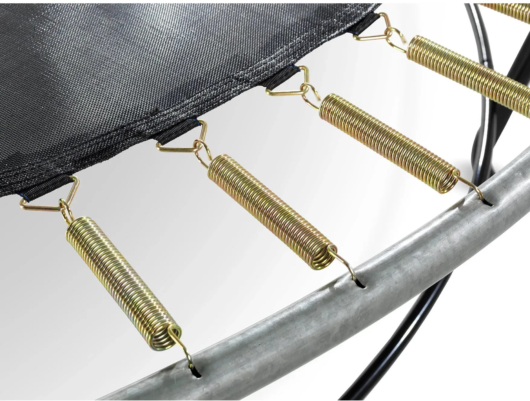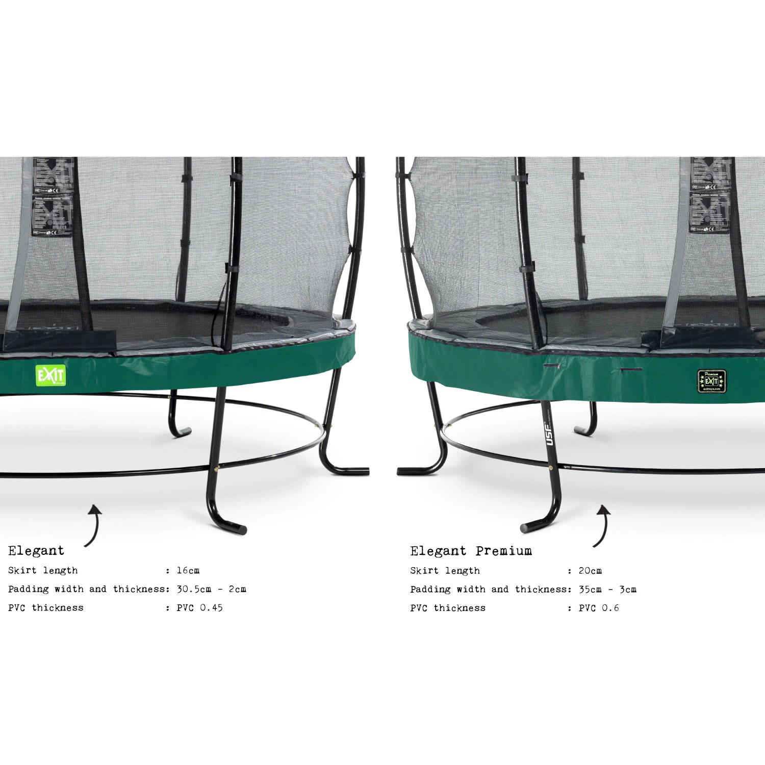 Der patentierte Ultimate-Stability-Frame (USF) mit seinen einmaligen L-förmigen Füssen ist unglaublich stark und dadurch supersicher und stabil. Zum Trampolin Elegant Premium von Exit wird standardmässig ein Deluxe-Sicherheitsnetz mit kinderfreundlichem Eingang durch die überlappende Tür mitgeliefert. Das Sicherheitsnetz ist hochwertig verarbeitet und hat extradicken Schaum rund um die Pfosten. Durch Glasfiberringe an der Ober- und Unterseite steht es rund gespannt. Das Trampolin Elegant Premium ist nicht nur schön, sondern auch noch langlebig. Der Rahmen ist galvanisiert und pulverbeschichtet, sodass Rost keine Chance hat. Im Vergleich zum Trampolin Standard Elegant hat es extralange Federn für das ultimative Sprungerlebnis und eine längere Schürze am Schutzrand für ein schöneres Erscheinungsbild. Ausserdem ist die Füllung für noch mehr Schutz dicker und die dickere PVC-Oberschicht sorgt für eine längere Lebensdauer. Dank des innovativen Befestigungssystems des Rahmens lässt sich das Trampolin viel einfacher montieren als andere Trampoline. Der Schutzrand ist stabil und mit dem von Exit Toys entwickelten Foot-Protection-System (FPS) ausgestattet, sodass Sie beim Trampolinspringen nie mehr mit dem Fuss zwischen die Federn kommen können. Das Trampolin Elegant Premium ist innerhalb von 1 h fertig für den Gebrauch, also worauf warten Sie noch? Lassen Sie uns springen!