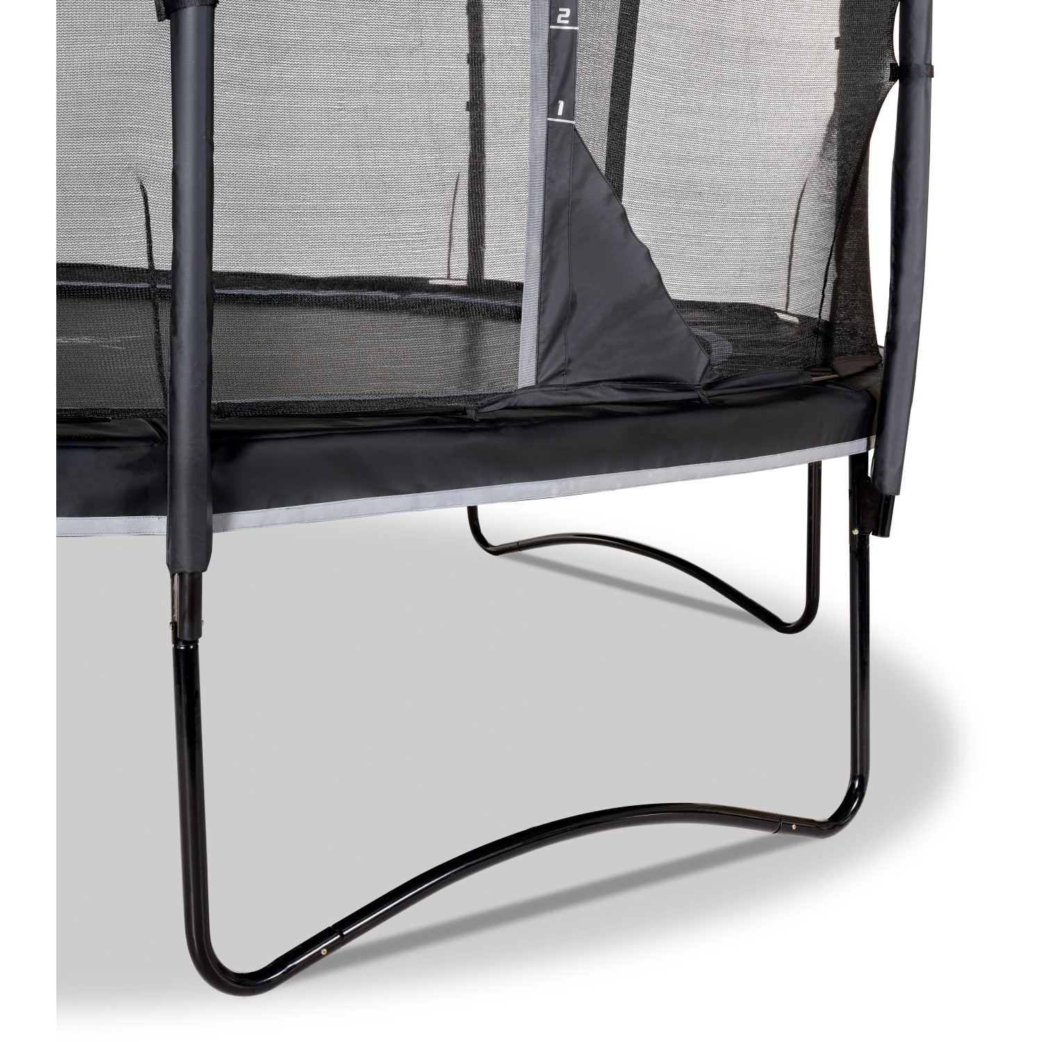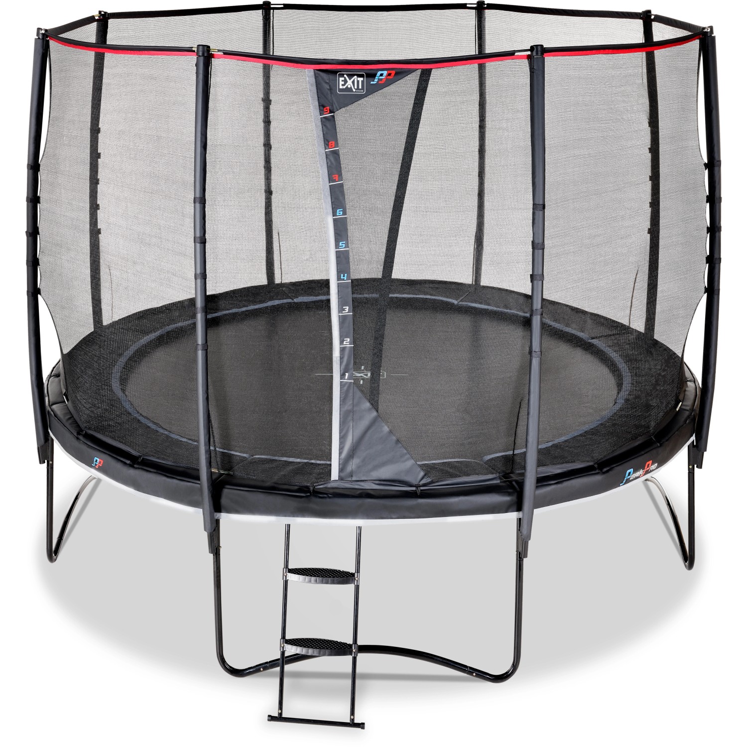 Das Trampolin PeakPro mit Sicherheitsnetz verfügt über einen mattschwarzen Schutzrand und bietet erstklassigen Sprungkomfort. Der schwarze Rahmen, die dezenten Farbdetails sowie reflektierende Paspeln verleihen dem grossen Trampolin eine robuste Ausstrahlung. Dieses Trampolin wird inklusive Leiter geliefert, sodass Sie sicher und schnell auf das Trampolin steigen können. Die Trampoline der Reihe PeakPro sind für Kinder mit viel Springerfahrung geeignet. Die flexiblen Springfedern des Trampolins sind nicht weniger als 25 cm lang und ermöglichen ein müheloses Springen in grosse Höhen. Das serienmässige Sicherheitsnetz ist mit einem Sprungmesser ausgestattet, sodass jeder sehen kann, wie hoch er oder sie springt. Der Trampolinrahmen ist galvanisiert und pulverbeschichtet und hat daher eine lange Lebensdauer. Ausserdem sind die Füsse und das Oberrohr sehr stabil, sodass das Trampolin auch bei den wildesten Sprüngen an seinem Platz bleibt. Das hochwertige Sicherheitsnetz des PeakPro und der robuste Schutzrand schützen die Akteure im Falle eines Fehlsprungs. Und das spezielle Fussschutzsystem sorgt dafür, dass die Füsse beim Springen nicht zwischen die Federn geraten.