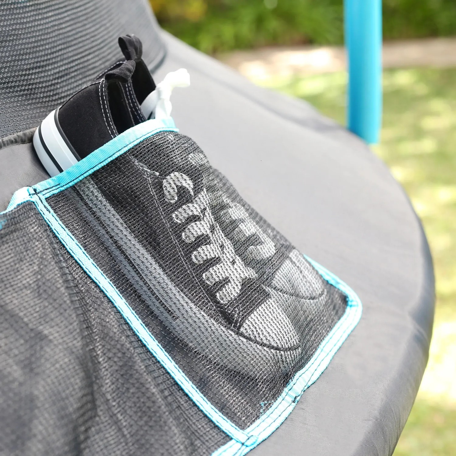 Das Trampolinin in der Farbe Blau-Schwarz hat einen Durchmesser von 366 cm.