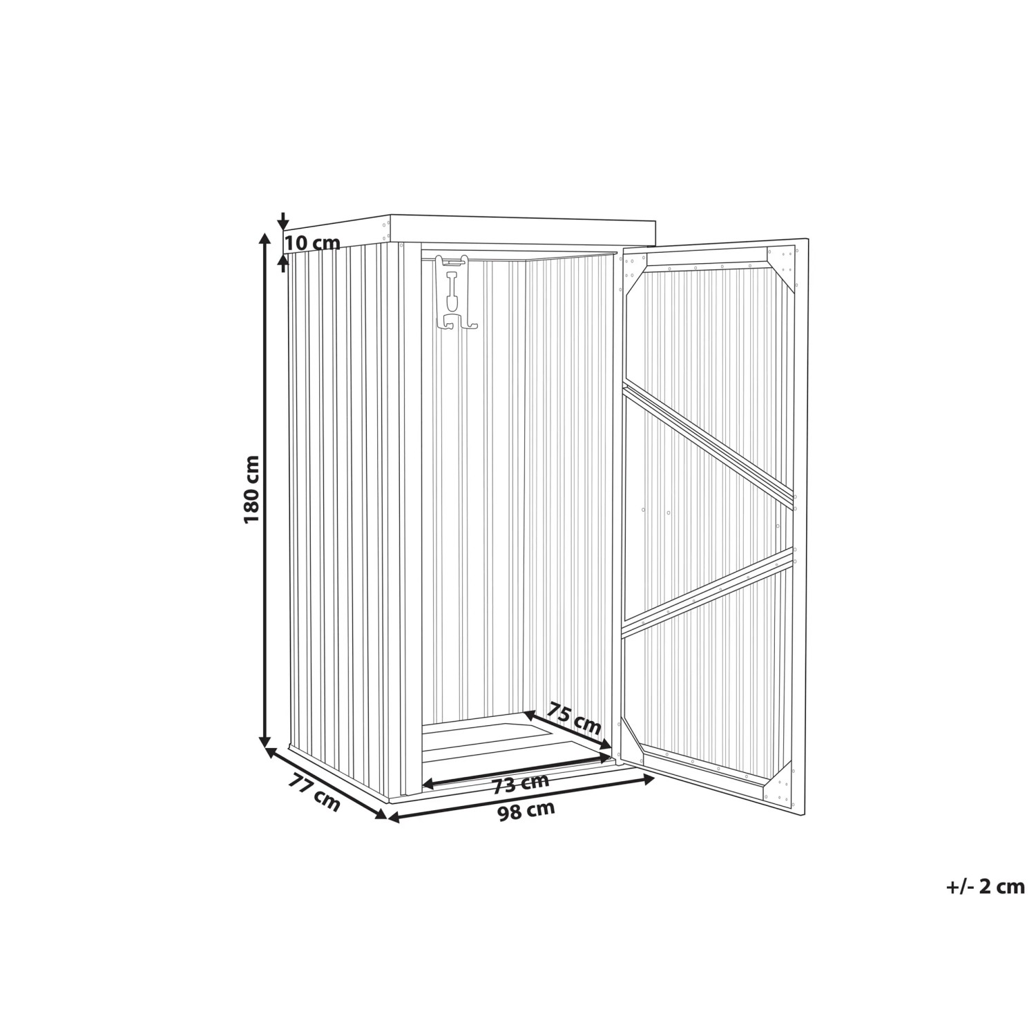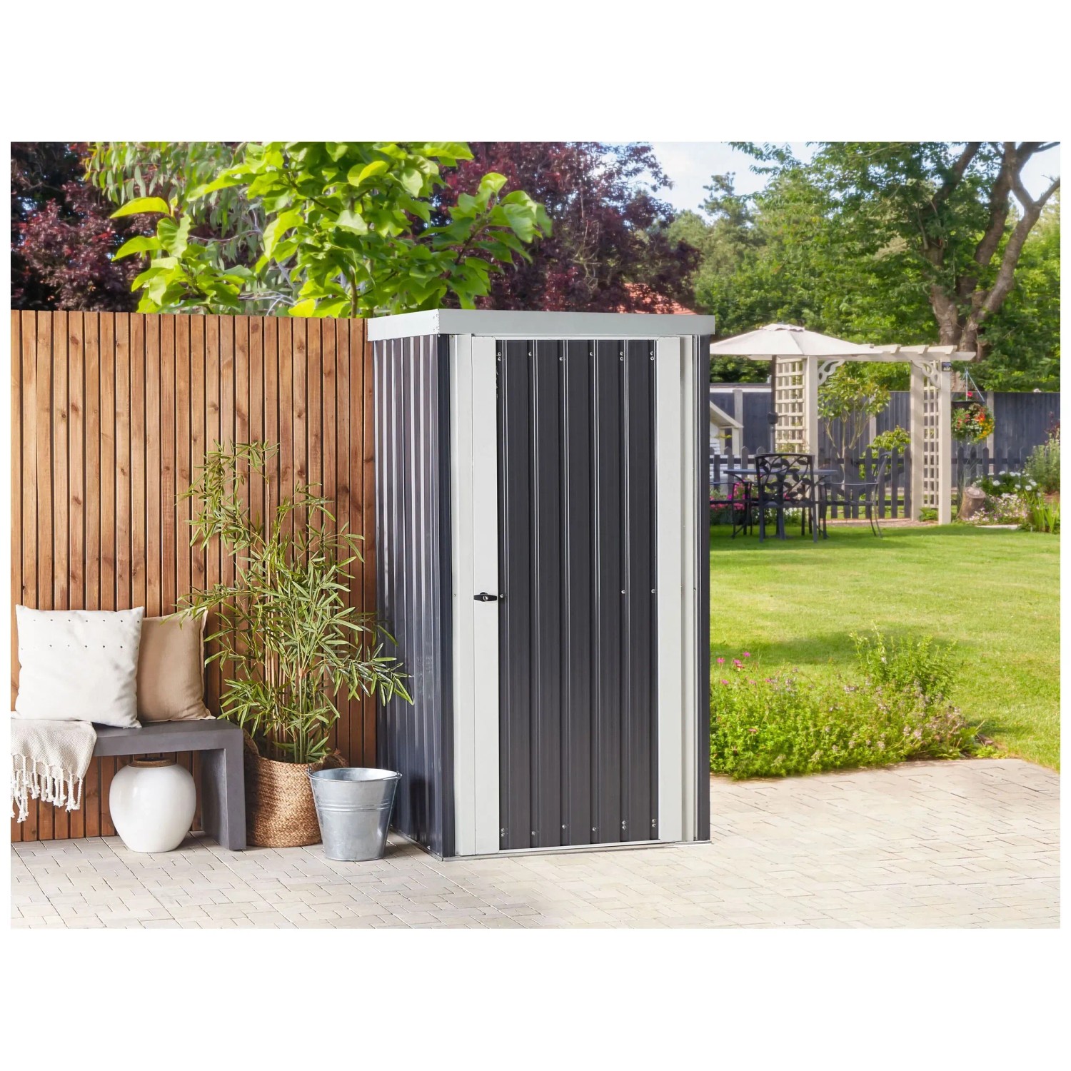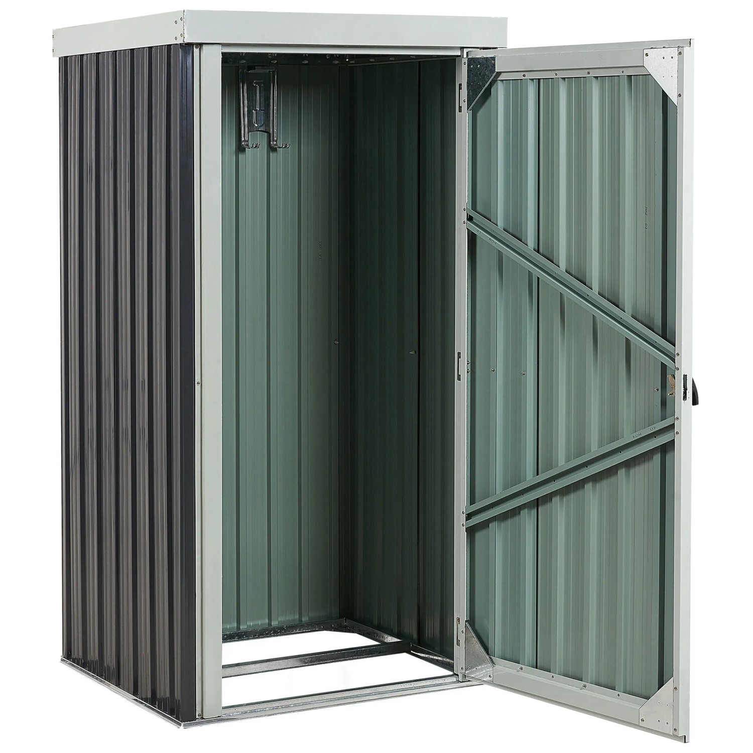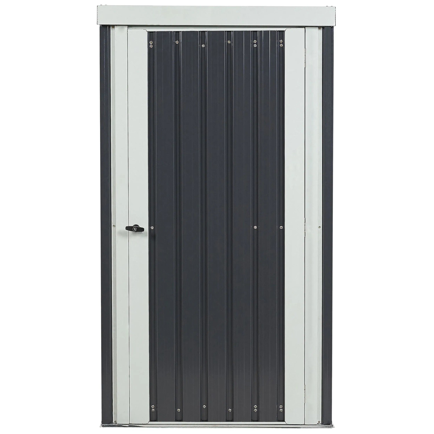 Das moderne Gerätehaus Umbria aus Metall bietet eine praktische Lösung zur Aufbewahrung von Gartengegenständen. Mit seiner kompakten Grösse und dem ansprechenden Design passt es perfekt in kleinere Aussenbereiche. Die Wände bestehen aus dickem, verzinktem Stahl-Trapezblech, das pulverbeschichtet ist, um Stabilität, Korrosions- und Wetterbeständigkeit zu gewährleisten. Das Gerätehaus verfügt über eine integrierte Dachrinne, die Regenwasser effizient ableitet, sowie über vier Haken für Gartenzubehör. Die Tür ist mit einem Drehgriff-Zylinderschloss ausgestattet, das ein einfaches Verschliessen ermöglicht. Das Haus ist für die ganzjährige Nutzung im Freien geeignet und bietet eine solide Verarbeitung. Es ist schmutz-, UV- und rostbeständig und sollte auf einer harten Oberfläche platziert werden, da es keinen Boden besitzt.