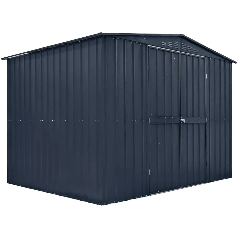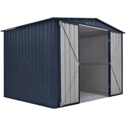 Dieses Gerätehaus ist eine besonders stabile Konstruktion mit stahlverstärkten Querstreben. Es verfügt auf der Vorder- und Rückseite über Lüftungsschlitze, eine 194 cm hohe und 134 cm breite Tür und eignet sich sehr gut zum Verstauen von grossen Gartengeräten.