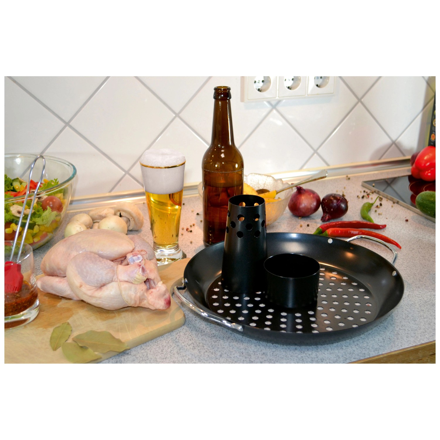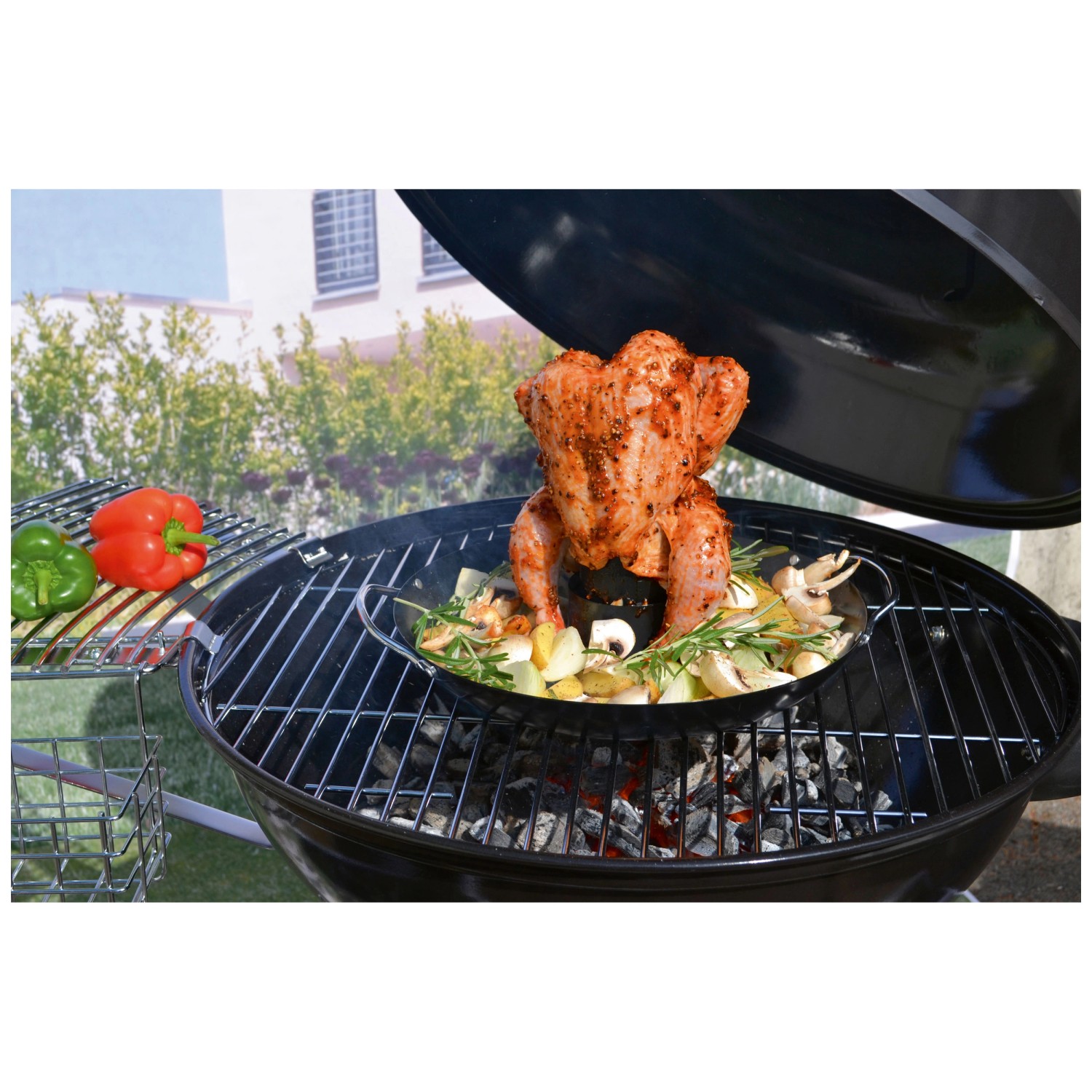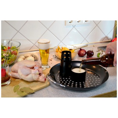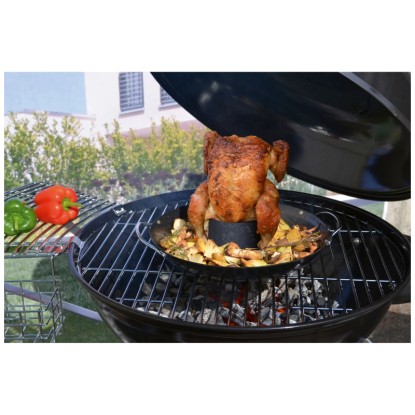 Die antihaftbeschichtete Oberfläche garantiert, dass kein Fleisch am Geflügelhalter haften bleibt. Ein integrierter Behälter dient dem Aromatisieren des Geflügels, indem Sie ihn einfach mit Marinade, Bier oder anderen schmackhaften Flüssigkeiten füllen. Um das mittig positionierte Geflügel kann in der Schale noch Gemüse oder anderes Grillgut garen.