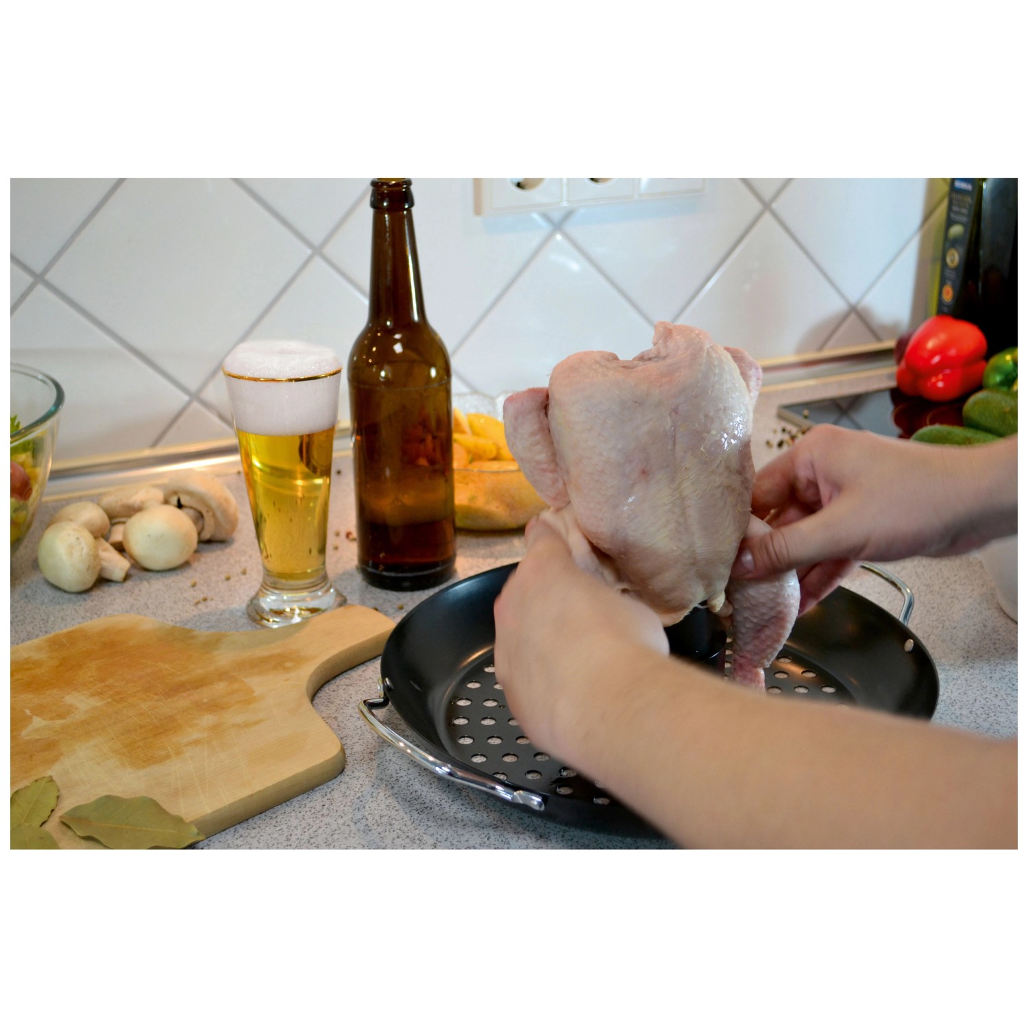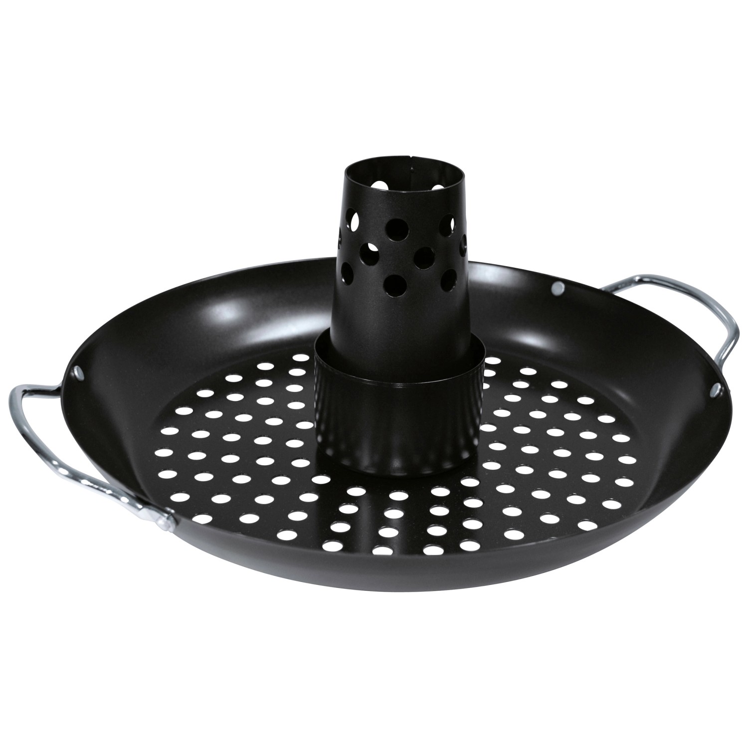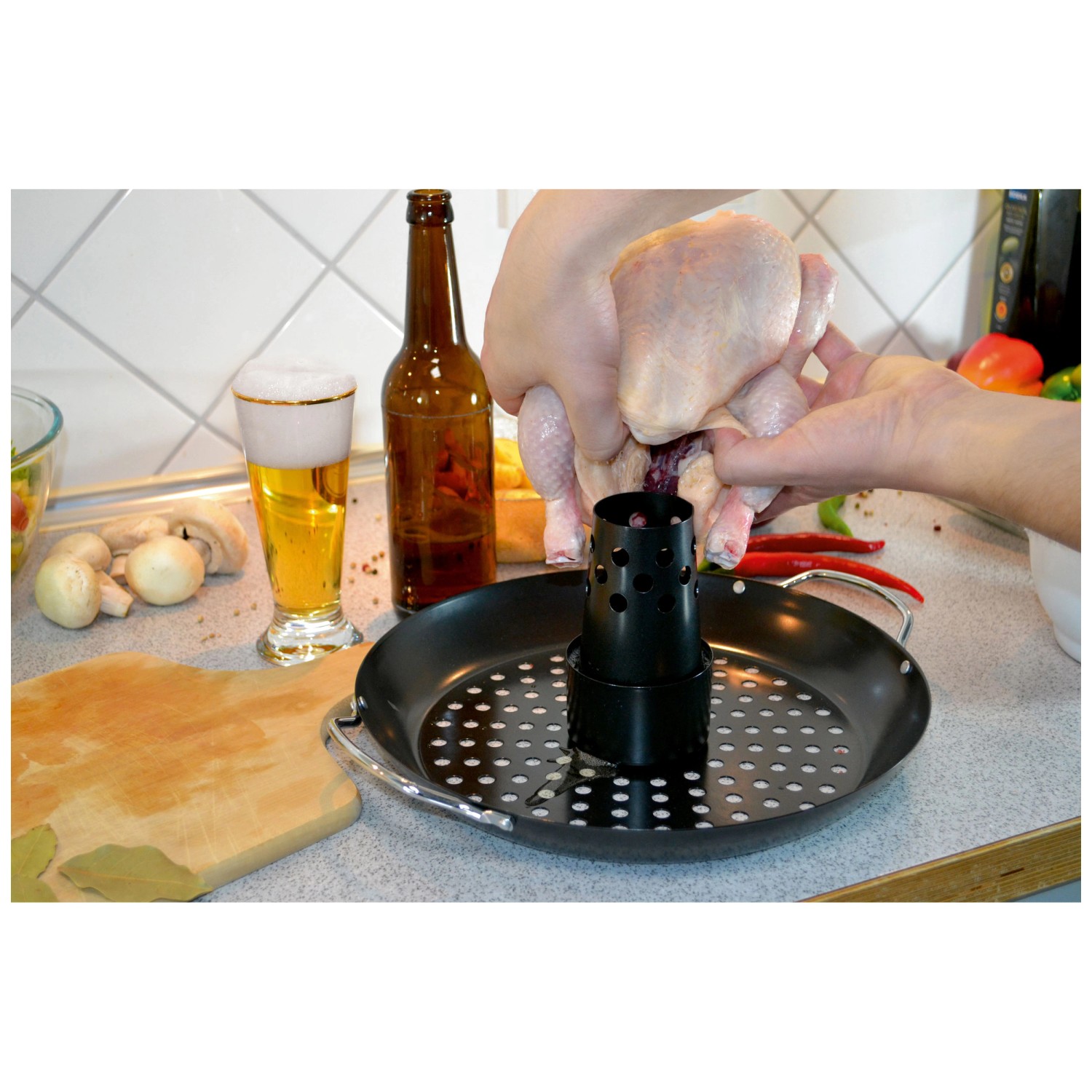 Die antihaftbeschichtete Oberfläche garantiert, dass kein Fleisch am Geflügelhalter haften bleibt. Ein integrierter Behälter dient dem Aromatisieren des Geflügels, indem Sie ihn einfach mit Marinade, Bier oder anderen schmackhaften Flüssigkeiten füllen. Um das mittig positionierte Geflügel kann in der Schale noch Gemüse oder anderes Grillgut garen.