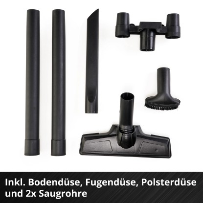 Der Akku-Handstaubsauger TE-HV 18/06 Li von Einhell ist ein kompakter Helfer, um Schmutz zu beseitigen. Das handliche Kraftpaket ist Teil der flexibel kombinierbaren Produktfamilie Power-X-Change von Einhell. Ausgestattet mit einer Bodendüse für Hartböden und glatte Flächen, einer Polsterdüse für Polster, Autositze und Stoffe und einer 26 cm langen Fugendüse für schwer erreichbare Stellen reinigt der Handsauger blitzschnell jede Oberfläche. Mit Hilfe der beiden Saugrohre (Gesamtlänge 70 cm) lässt sich der Handsauger auch als Bodenstaubsauger einsetzen. Auf Knopfdruck wird der Staubbehälters entleert. Der Schmutzfilter kann mit Wasser gereinigt, vollständig getrocknet und weiterverwendet werden. Platzsparend aufbewahrt wird der Sauger an der Wandhalterung.