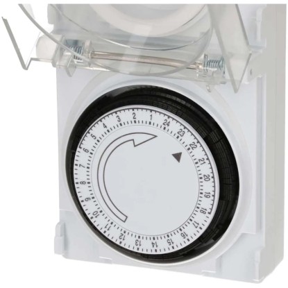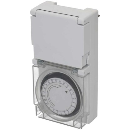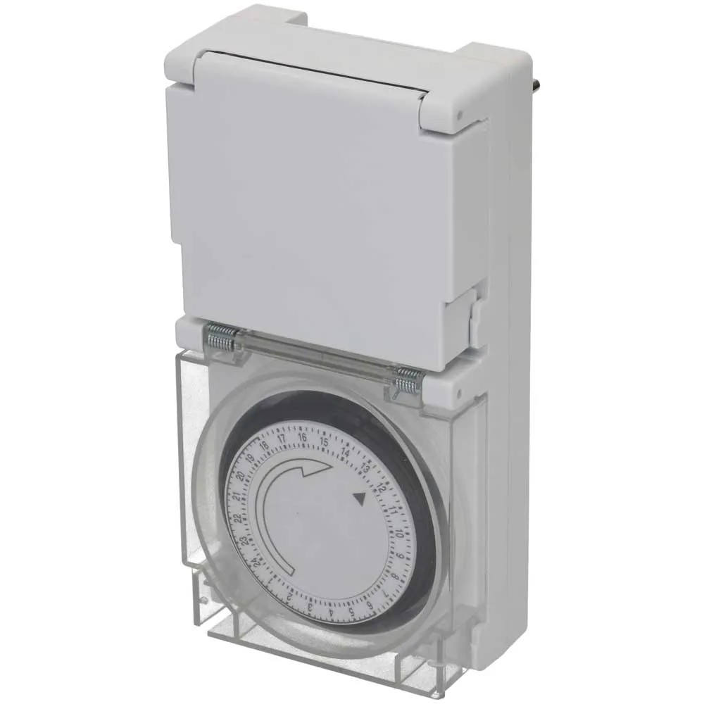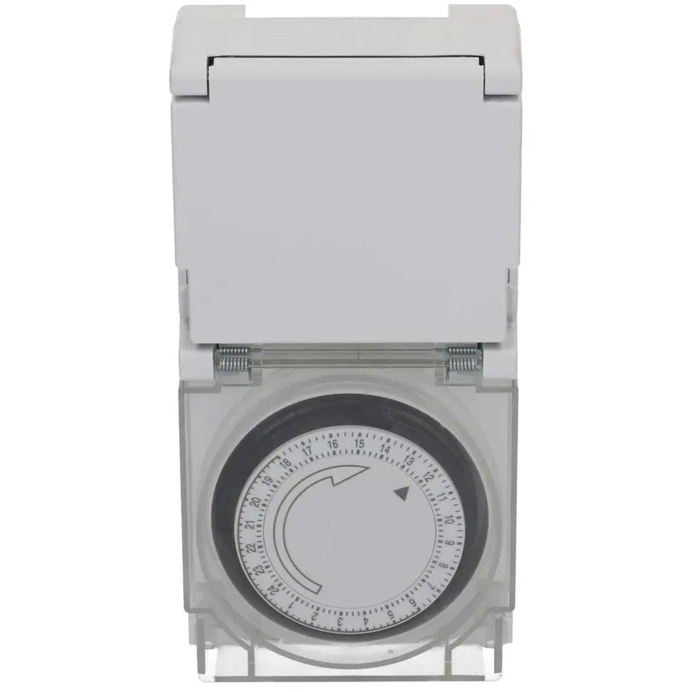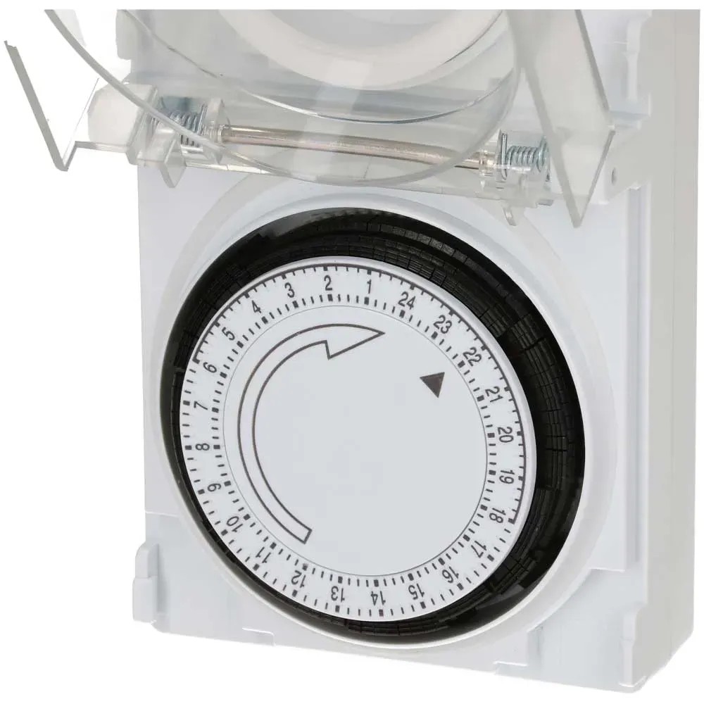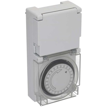 Diese mechanische Zeitschaltuhr mit der Schutzart IP55 ist strahlwassergeschützt und bestens für den Einsatz im Freien geeignet. Die Tageszeitschaltuhr mit 24-h-Programm besitzt eine grosse, transparente Schutzabdeckung und es können bis zu 96 Schaltsegmente pro Tag eingestellt werden. Der minimale Schaltabstand beträgt 15 min.