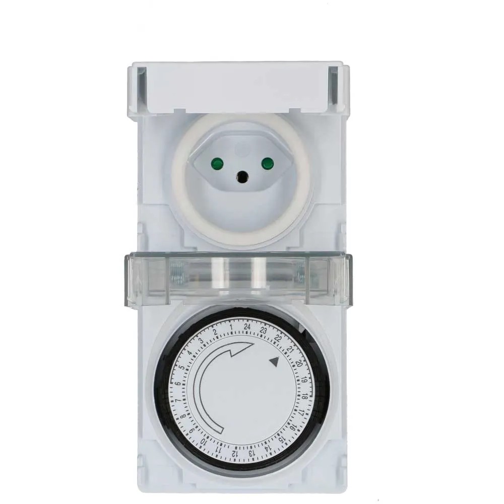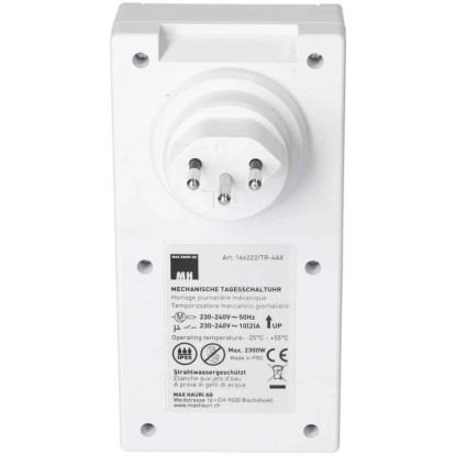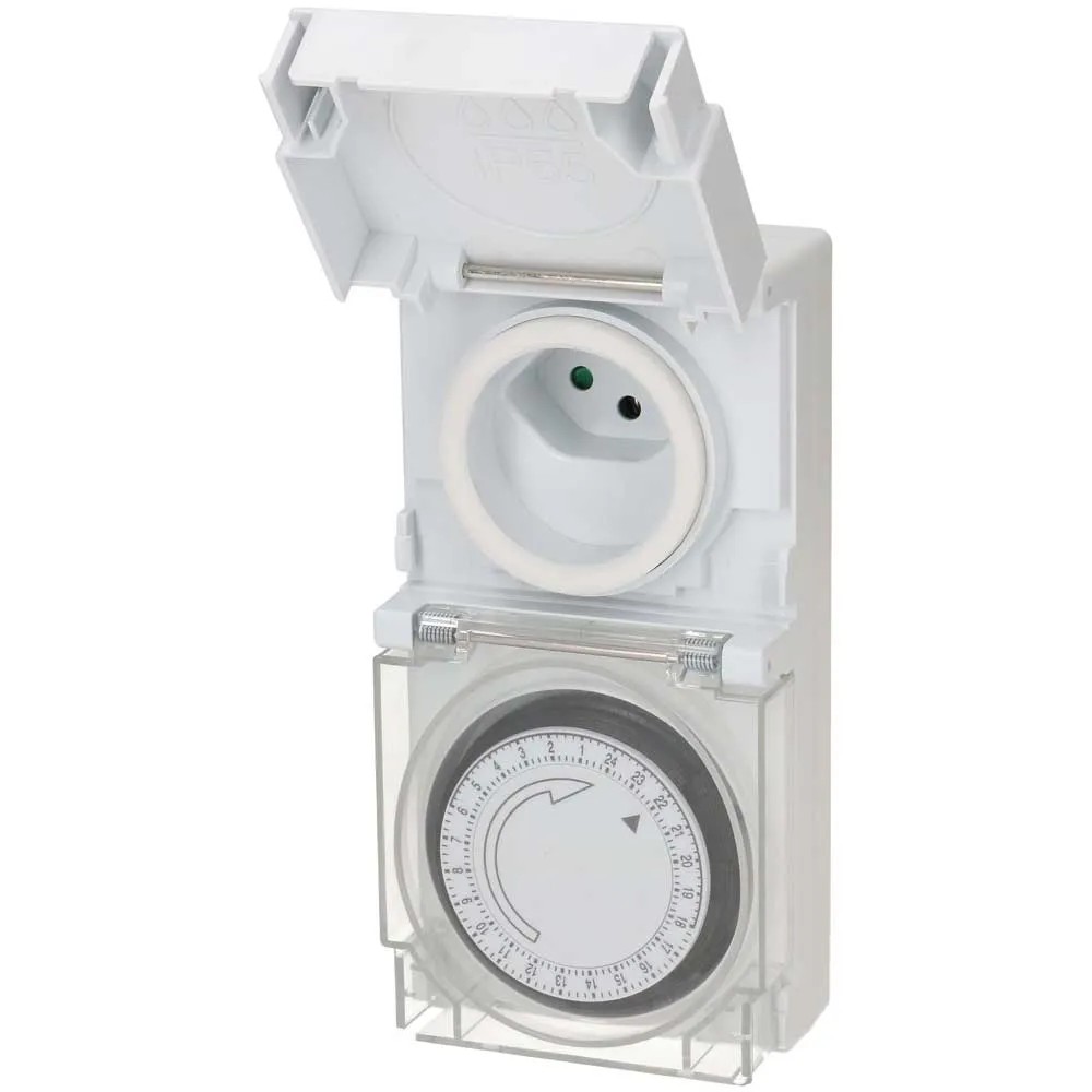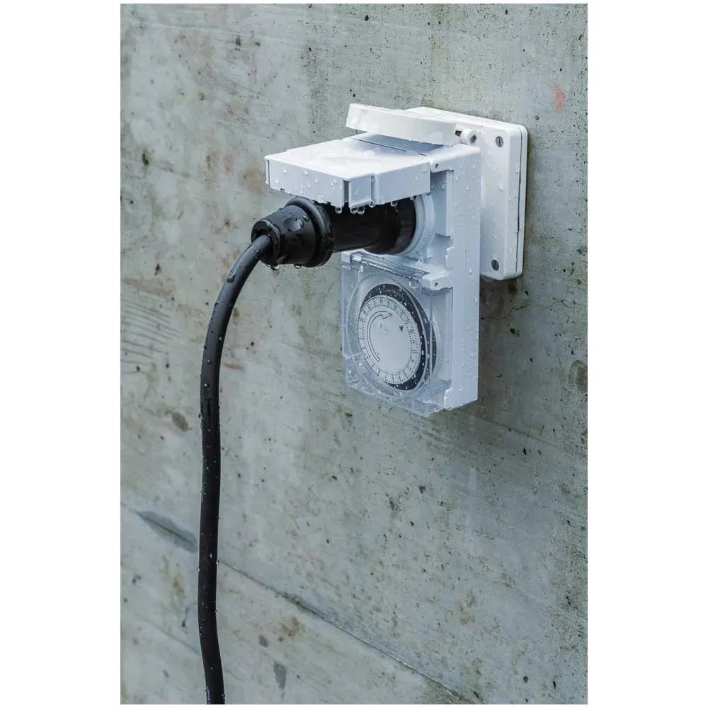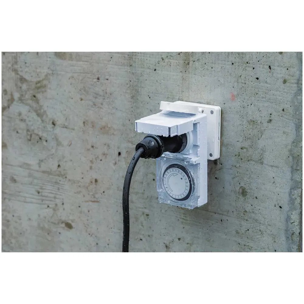 Diese mechanische Zeitschaltuhr mit der Schutzart IP55 ist strahlwassergeschützt und bestens für den Einsatz im Freien geeignet. Die Tageszeitschaltuhr mit 24-h-Programm besitzt eine grosse, transparente Schutzabdeckung und es können bis zu 96 Schaltsegmente pro Tag eingestellt werden. Der minimale Schaltabstand beträgt 15 min.