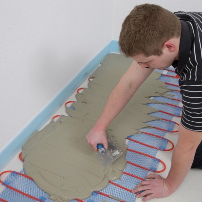 Die vorgefertigten Heizmatten werden im Raum ausgerollte, mit Hilfe der mitgeliefert Bodendübel fixiert und können danach mit einer flexiblen Ausgleichsmasse überdeckt werden. Der Anschluss erfolgt an ein vorhandenes Warmwasser- Heizsystem. Ist die Vorlauftemperatur der Heizungsanlage höher als +40 °C wird ein Rücklauftemperaturbegrenzer (separat erhältlich) zur Steuerung benötigt.