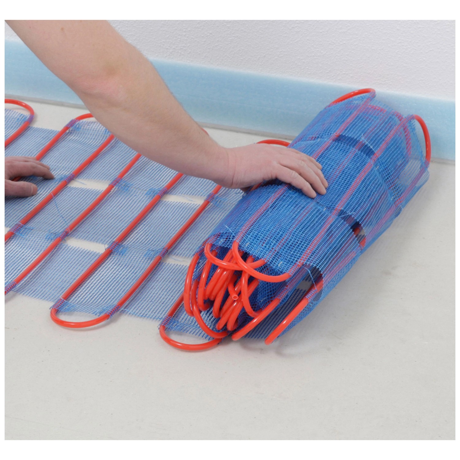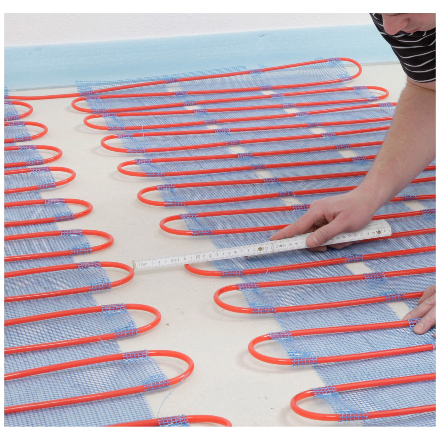 Die vorgefertigten Heizmatten werden im Raum ausgerollte, mit Hilfe der mitgeliefert Bodendübel fixiert und können danach mit einer flexiblen Ausgleichsmasse überdeckt werden. Der Anschluss erfolgt an ein vorhandenes Warmwasser- Heizsystem. Ist die Vorlauftemperatur der Heizungsanlage höher als +40 °C wird ein Rücklauftemperaturbegrenzer (separat erhältlich) zur Steuerung benötigt.