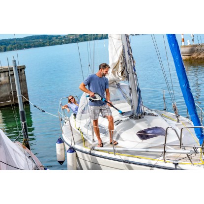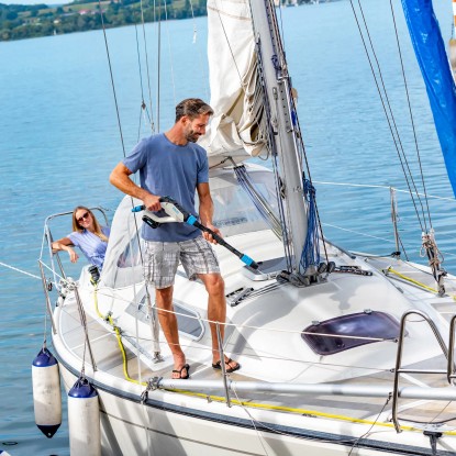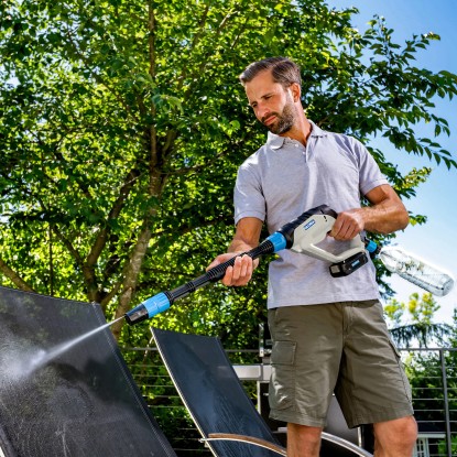 Angetrieben von jedem Bosch 18V Power4All Akku ist die MultiJet 18V zudem unabhängig von einem Stromkabel und jederzeit dort einsatzbereit. wo sie gebraucht wird. Ganz egal. ob im Garten. rund um das Haus oder im Kofferraum verstaut beim nächsten Camping-Urlaub oder der Mountainbike-Tour. Der Aufsatz zur Ausbringung von Reinigungsschaum erweitert das Einsatzspektrum der MultiJet 18V. Einfach Reinigungsmittel in den Behälter füllen. anklicken und schon sprüht die MultiJet 18V Reinigungsschaum. der auf der Oberfläche haftet und Schmutzpartikel löst.