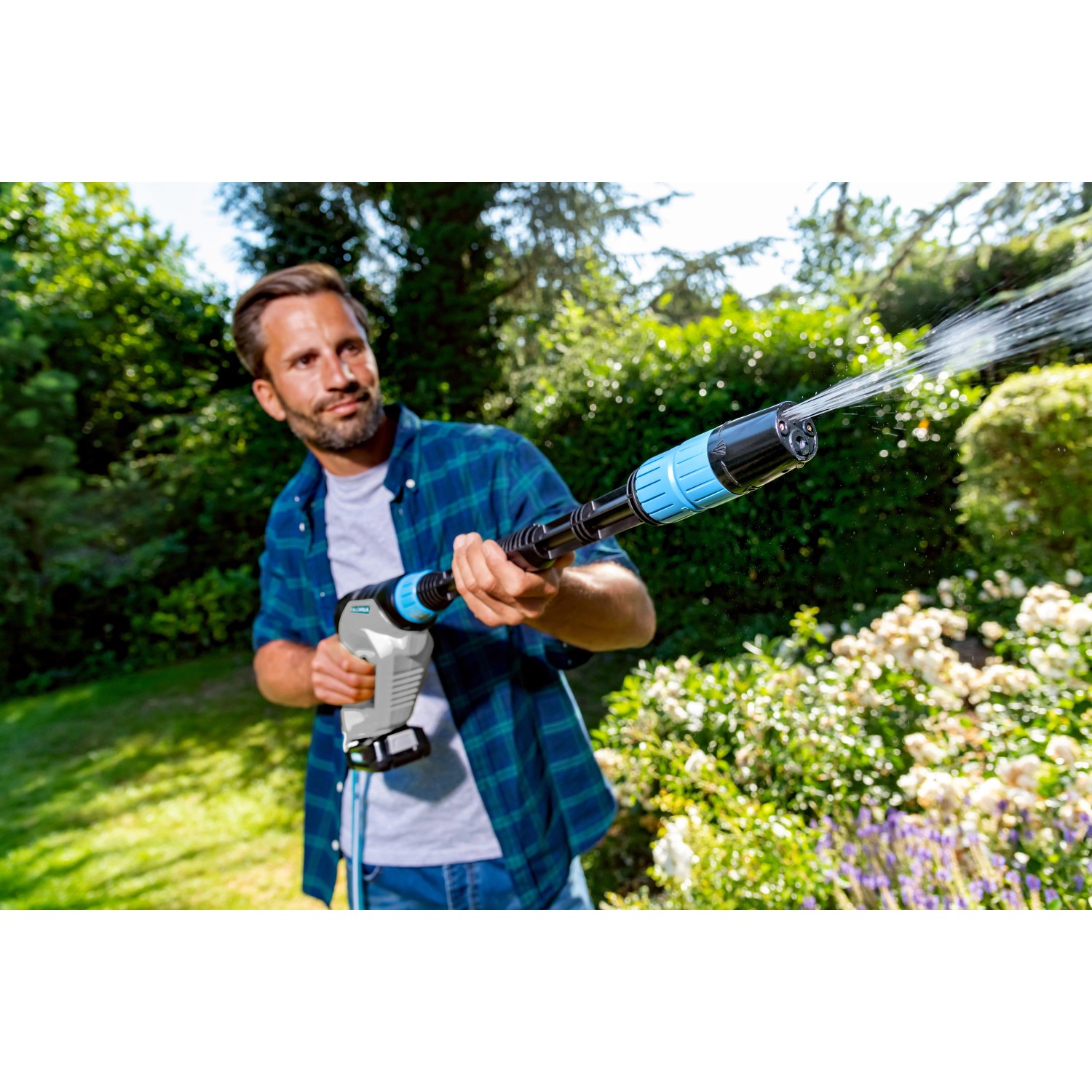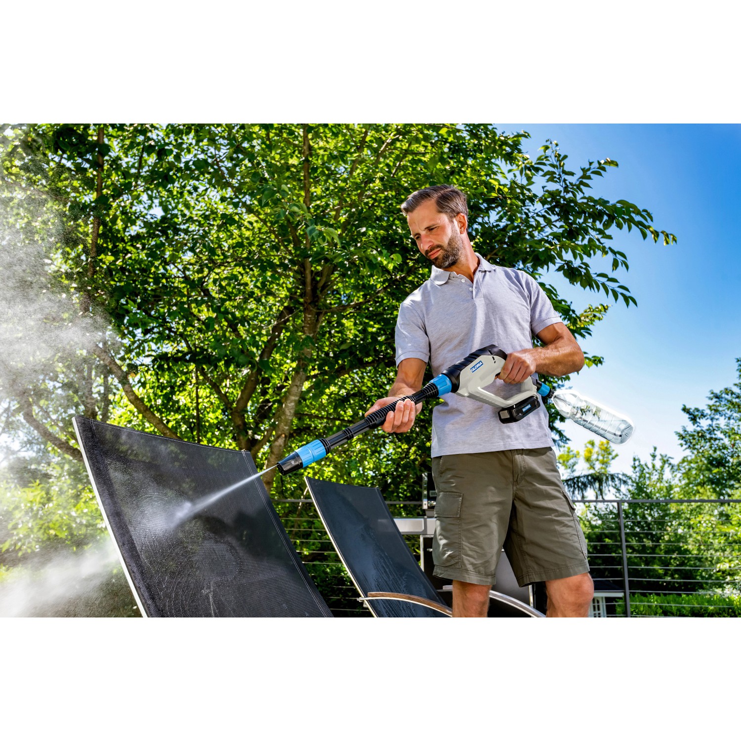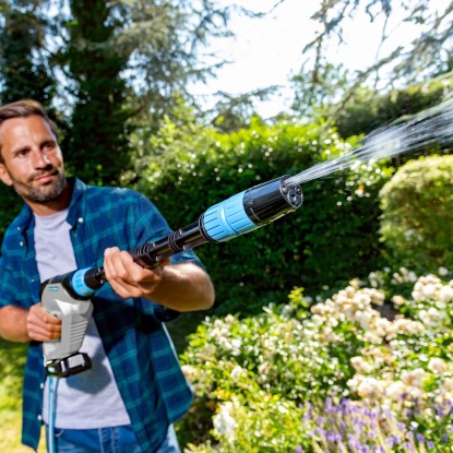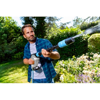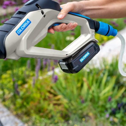Zusätzliches Zubehör ermöglicht es mit dem MultiJet 18V Sprühsystem zu bürsten oder Pflanzenschutzmittel auszubringen und mit dem Gloria Universal Behälter mit 10 L Füllinhalt kann die Wasserquelle bequem transportiert werden.