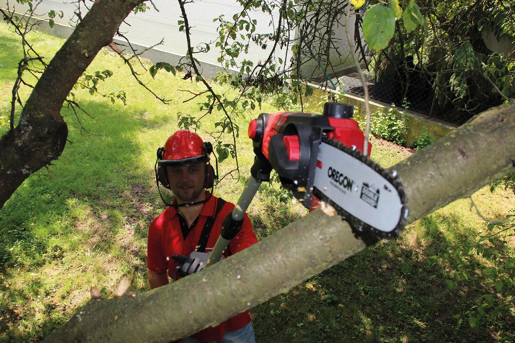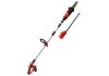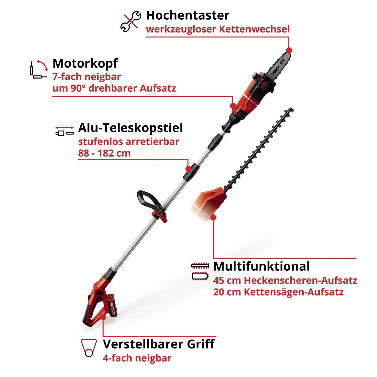 Das Akku-Multifunktionswerkzeug GE-HC 18 Li T Kit ist ein leistungsstarkes Gerät, mit dem sich höher gelegene Äste und hohe Hecken mühelos und stromnetzunabhängig vom Boden aus beschneiden lassen. Durch das neue Power X-Change Batteriesystem von Einhell verfügt das Multitool über einen 18 V Akku mit 3,0 Ah für ausgedehnte Arbeitseinsätze. Dabei sorgt das Metallgetriebe für hohe Langlebigkeit und das Oregon-Qualitätsschwert und die Oregon-Kette für saubere Schnittresultate. Der um 90° drehbare Aufsatz sorgt dabei für mühelose Horizontalschnitte. Der Krallenanschlag verhindert dabei ein Abrutschen beim Sägen.