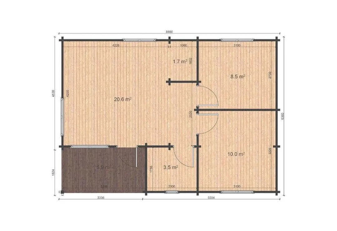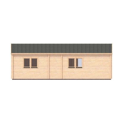 Das Gartenhaus hat einen Dachüberstand von ca. 62 cm vorne, 15 cm hinten sowie je 10 cm links und rechts. Die Dachfläche beträgt etwa 36 m², und die Dachneigung beträgt 16°. Es ist mit einer Halbglas-Einzeltür (85 cm x 194 cm) und zwei Vollholz-Einzeltüren (85 cm x 194 cm) ausgestattet. Zudem gibt es zwei Einzelfenster (70 cm x 92 cm) und zwei Doppelfenster (92 cm x 130 cm), die als Dreh-/Kippfenster ausgeführt sind. Die Wandstärke des Gartenhauses beträgt 44 mm.