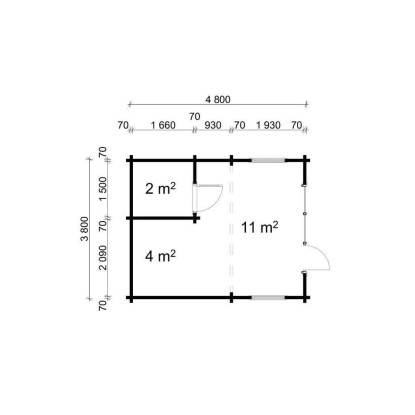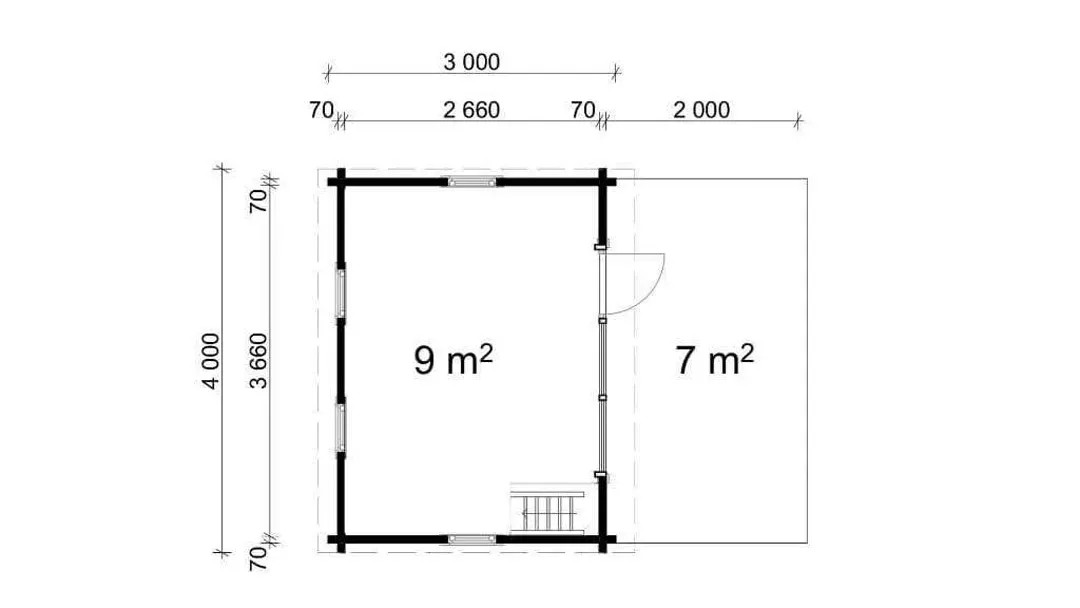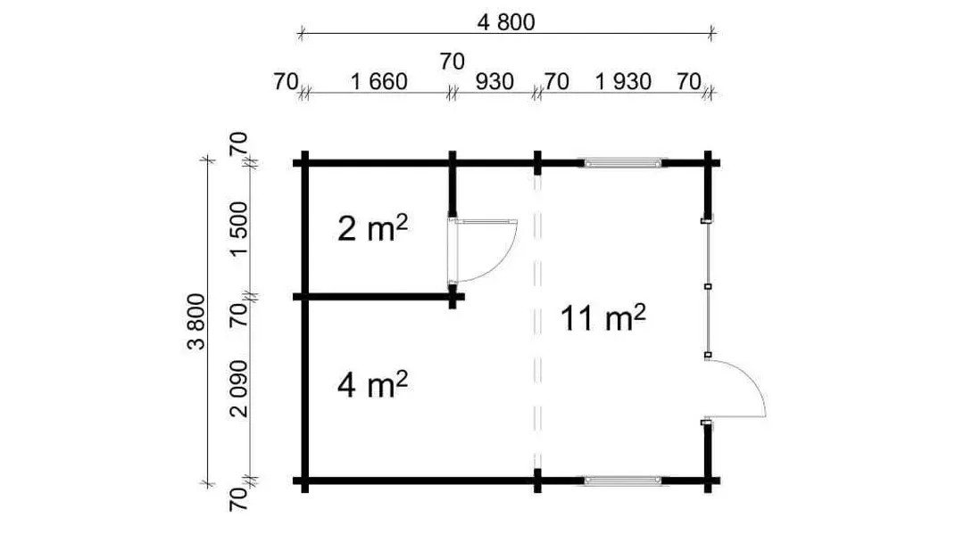 Das Gartenhaus ist mit zwei Leimholz-Einzeltüren mit Vollglas (ca. 80 cm x 198 cm) und einer Leimholz-Einzeltür aus Vollholz (ca. 80 cm x 198 cm) ausgestattet. Es verfügt über vier bodentiefe feststehende Fenster (ca. 80 cm x 198 cm), zwei Dreh-/Kipp-Einzelfenster (ca. 92 cm x 92 cm) und vier Kipp-Einzelfenster (ca. 50 cm x 50 cm). Die Wandstärke des Gartenhauses beträgt entweder 44 mm oder 70 mm (empfohlen für erhöhte Stabilität).