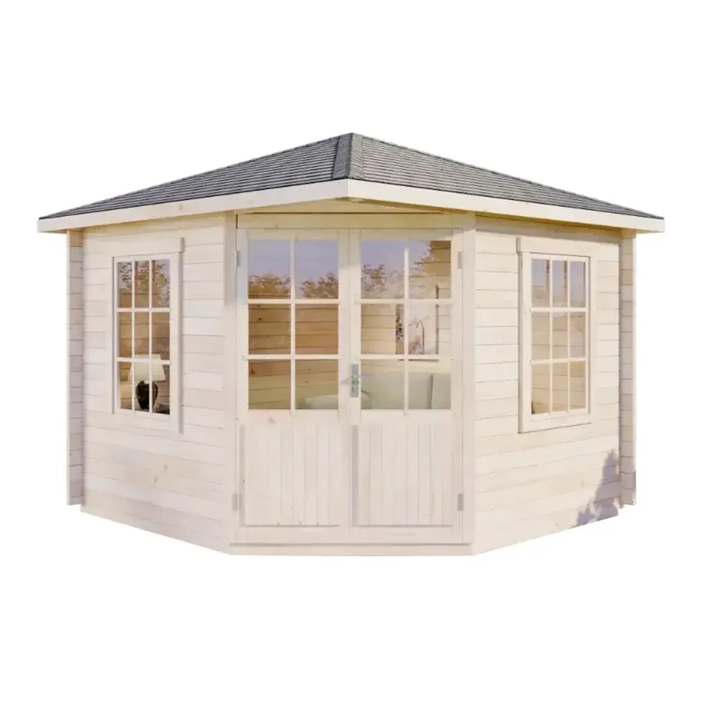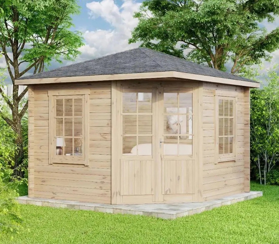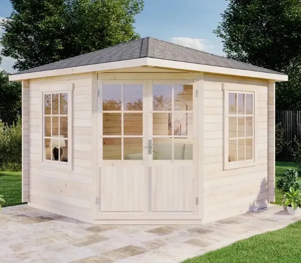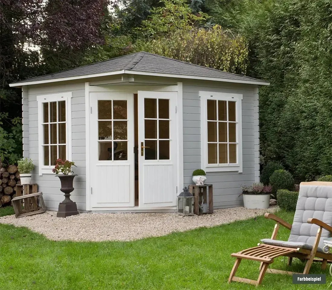 Das Holz-Gartenhaus Monica-28 von Alpholz eignet sich mit seiner Grundfläche von ca. 7 m², einem Rauminhalt von ca. 18,5 m³ und der schmucken fünfeckigen Form optimal als kleines, gemütliches Gartenhaus für Sie und Ihre Kinder. Damit Sie es bequem betreten können, verfügt es über eine Doppeltür mit einer grosszügigen Durchgangsbreite von ca. 134 cm bei einer Höhe von 190 cm. Durch die Anbringung der Tür an einer der Ecken des Gartenhauses bietet sich besonders eine Positionierung an einer Ecke Ihres Gartens an.