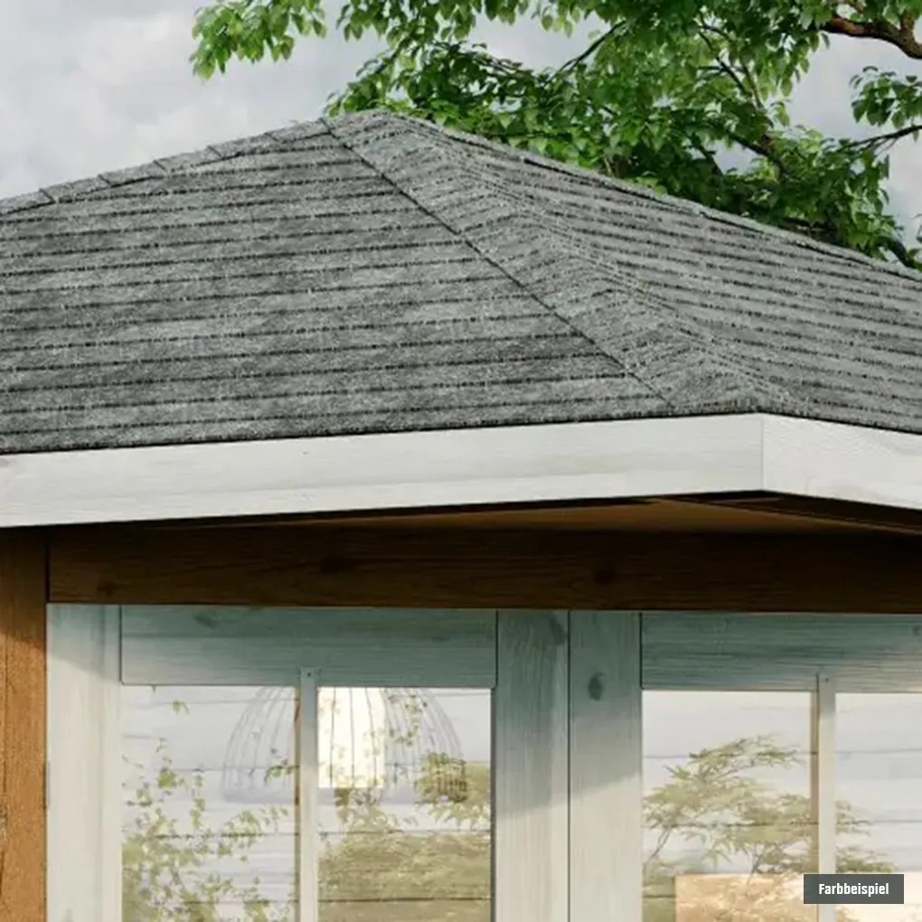 Eine Wandstärke von 28 mm macht die Konstruktion des Holzgartenhauses sehr stabil. Der passende Fussboden sowie die dazugehörigen Fundamenthölzer sind separat erhältlich. Das Dach aus Nut- und Federbrettern ist sehr robust und hält auch höheren Schneelasten im Winter problemlos stand. Aufgrund der speziellen Dachform als Spitzdach eignen sich hochwertige Dachschindeln besonders gut als Dacheindeckung - diese müssen zusätzlich erworben werden, da Monica ohne Dachpappe zur Ersteindeckung geliefert wird. Dank der Blockbohlenbauweise ist das Gartenhaus absolut wind- und regendicht. Dadurch sind auch widrige Witterungsverhältnisse kein Problem.| Massivholzdach aus Nut- und Federbrettern |