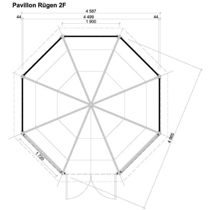 Das Gartenpavillon verfügt über eine Leimholz-Doppeltür mit den Massen ca. 172 cm x 202 cm und vier bodentiefe Panoramafenster mit den Massen ca. 172 cm x 202 cm, die nicht zu öffnen sind. Der Dachüberstand beträgt rund 30 cm, und die Wandstärke des Gartenpavillones beträgt 44 mm.