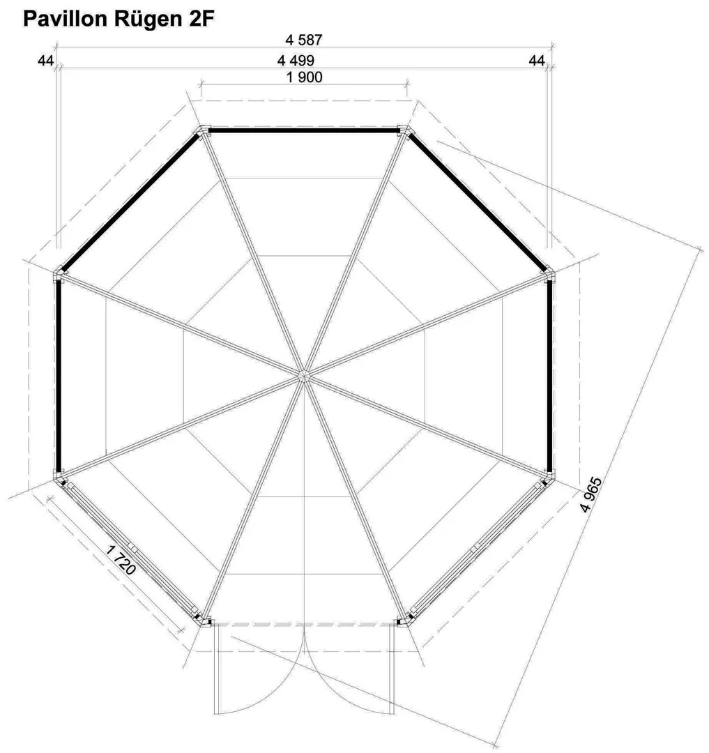 Das Alpholz Gartenpavillon Rügen mit Spitzdach hat einen Durchmesser von ca. 500 cm. Das Wandaussenmass beträgt etwa 459 cm x 459 cm, und die Grundfläche des Gartenpavillones beträgt ca. 17 m². Der umbaute Raum beträgt ca. 52,4 m³, die Seitenwandhöhe liegt bei ca. 215 cm und die Gesamthöhe beträgt etwa 360 cm.