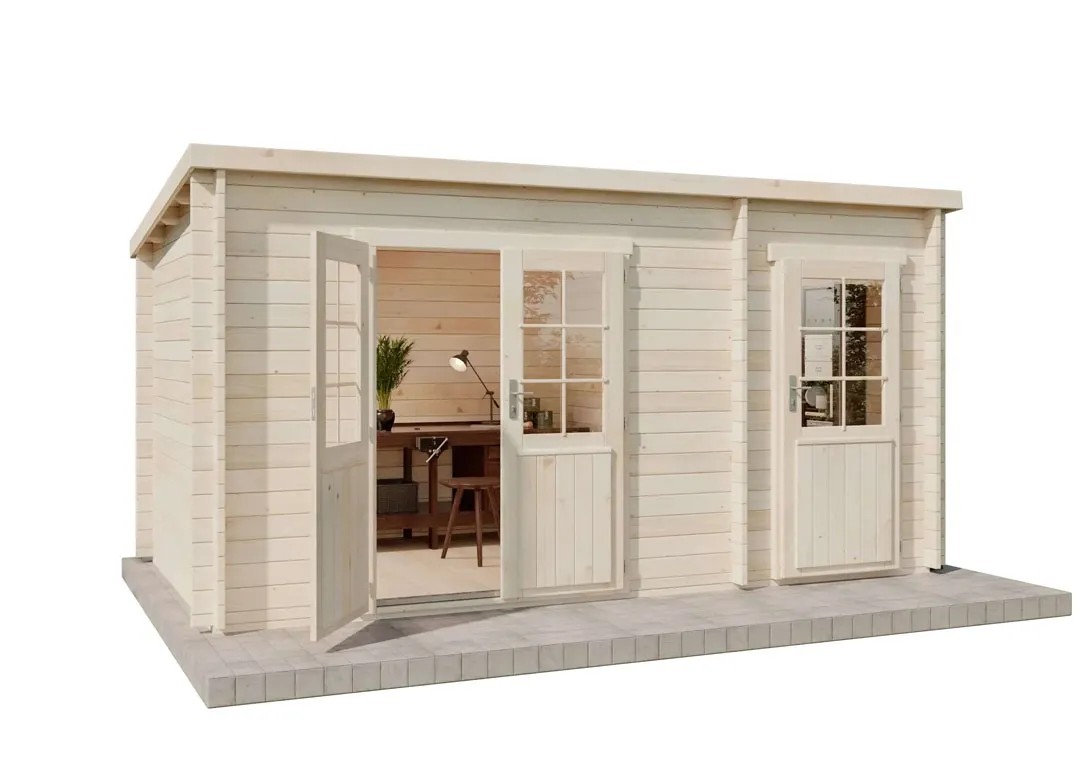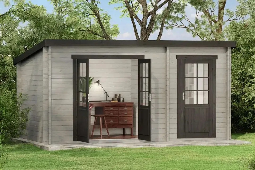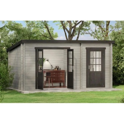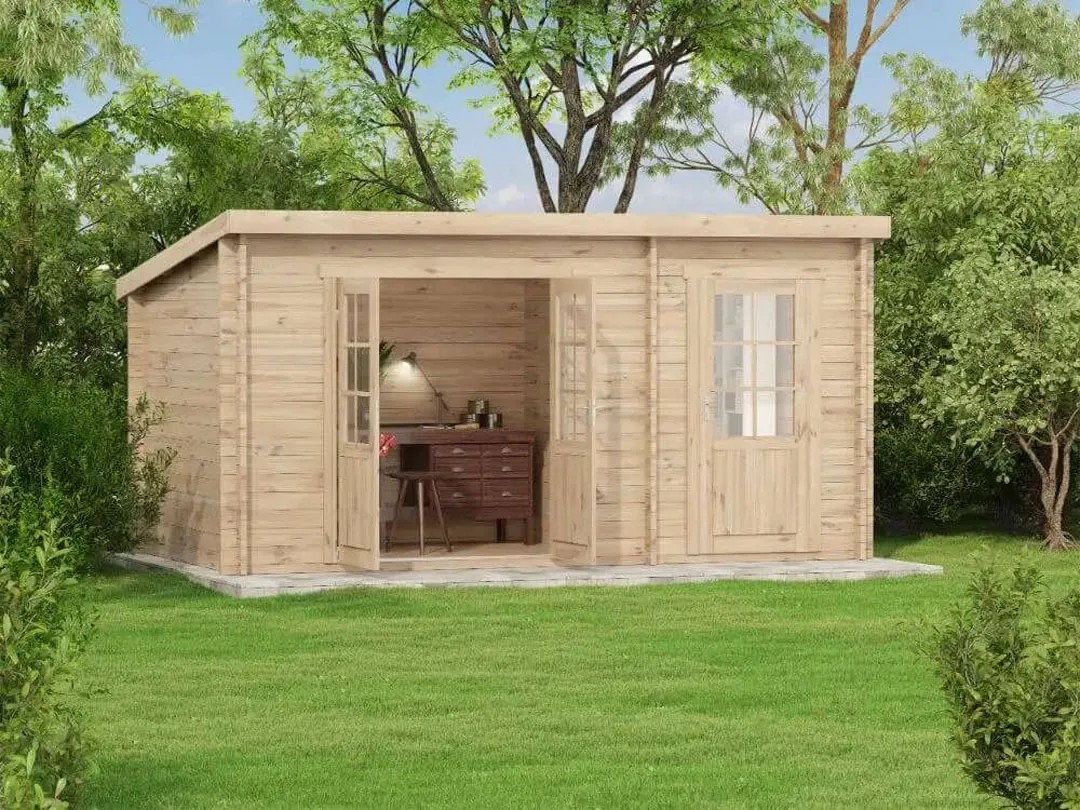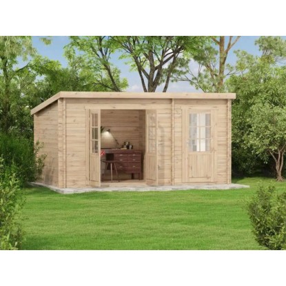 Das Gartenhaus ist aus imprägniertem Holz in Blockbohlenbauweise gefertigt. Durch die Imprägnierung wird kein weiterer Anstrich benötigt um das Haus vor Verwitterung zu schützen. Das Haus verfügt über eine robuste Konstruktion, mit einer Wandstärke von 40 mm. Das Dach des Gartenhauses ist als Pultdach konstruiert. Die Dacheindeckung ist separat erhältlich.