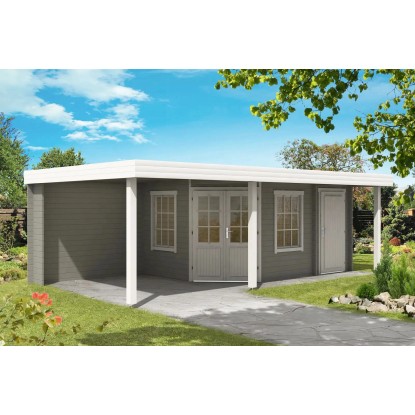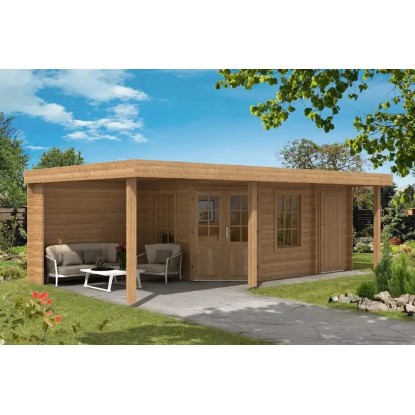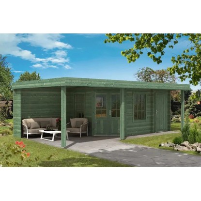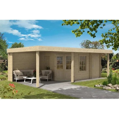 Das Gartenhaus ist in Blockbohlenbauweise aus unbehandeltem Holz gefertigt. Durch die naturbelassene Oberfläche bleibt eine natürliche Optik mit Holzmaserung erhalten. Zum Schutz vor Witterungseinflüssen sollte die Oberfläche individuell mit einer Lackierung oder Lasierung veredelt werden. Das Gartenhaus verfügt über eine robuste Konstruktion, mit einer Wandstärke von 40 mm. Die maximalen Schneelast des Flachdachs liegt bei 87 kg/m. Die Dacheindeckung ist separat erhältlich. Aufgrund der speziellen Dachform eignen sich hochwertige Dachbahnen besonders gut als Dacheindeckung.