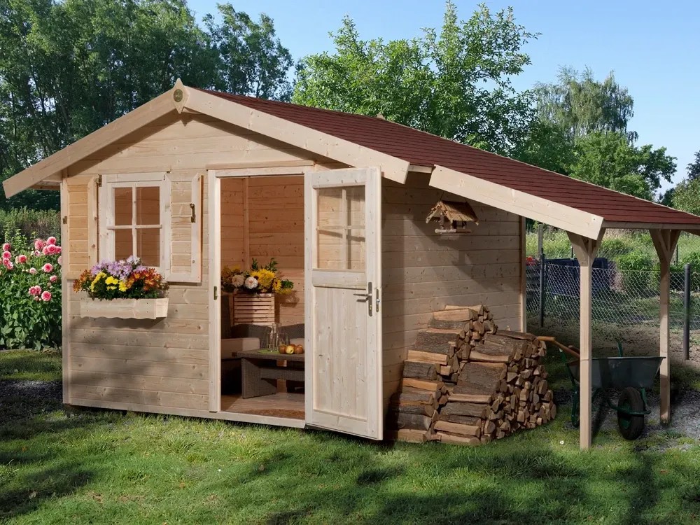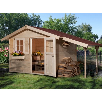 Das OBI Gartenhaus Bozen C ist ein Holzhaus in Massivholzbauweise aus 28 mm starken, naturbelassenen und sauber gehobelten Blockbohlen aus nordischer Fichte mit Nut und Feder. Der Fussboden ist eine Unterkonstruktion aus kesseldruckimprägnierten Bodenbalken und 19 mm starken Holzdielen mit Nut und Feder. Die Seitenwandhöhe beträgt 199 cm. Die Tür mit Fenster verfügt über ein Zylinderschloss mit 3 Schlüsseln. Das Fenster besitzt einen Dreh- und Kippbeschlag zum Öffnen. Das Dach besteht aus 19 mm starken Dachbrettern auf stabiler Dachpfette. Das Gartenhaus besitzt ein 20 cm Vordach. Geliefert wird das Gartenhaus im günstigen Sparset mit einem praktischen Schleppdach sowie Fensterladen und Blumenkasten. Das Schleppdach lässt sich sowohl links- als auch rechtsseitig montieren.