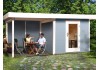 Das OBI Gartenhaus Florenz B Grösse 3 in Grau-Weiss ist ein modernes Gartenhaus in Massivholzbauweise aus 28 mm starken, naturbelassenen und sauber gehobelten Blockbohlen aus nordischer Fichte mit Nut und Feder. Der Fussboden ist eine Unterkonstruktion aus kesseldruckimprägnierten Bodenbalken und 19 mm starken Holzdielen mit Nut und Feder. Die Tür mit grossem Lichtausschnitt verfügt über ein Zylinderschloss mit drei Schlüsseln. Das Dach besteht aus 19 mm starken Dachbrettern auf stabiler Dachpfette. Das Gartenhaus besitzt ein 50 cm langes Vordach. An das Gartenhaus schliesst sich ein überdachter Aussenbereich an. Dieser kann links oder rechts montiert werden. Aussen ist das Haus mit einer Wetterschutzfarbe gestrichen, Tür, Fenster und Leisten sind weiss abgesetzt, der Innenraum ist naturbelassen.