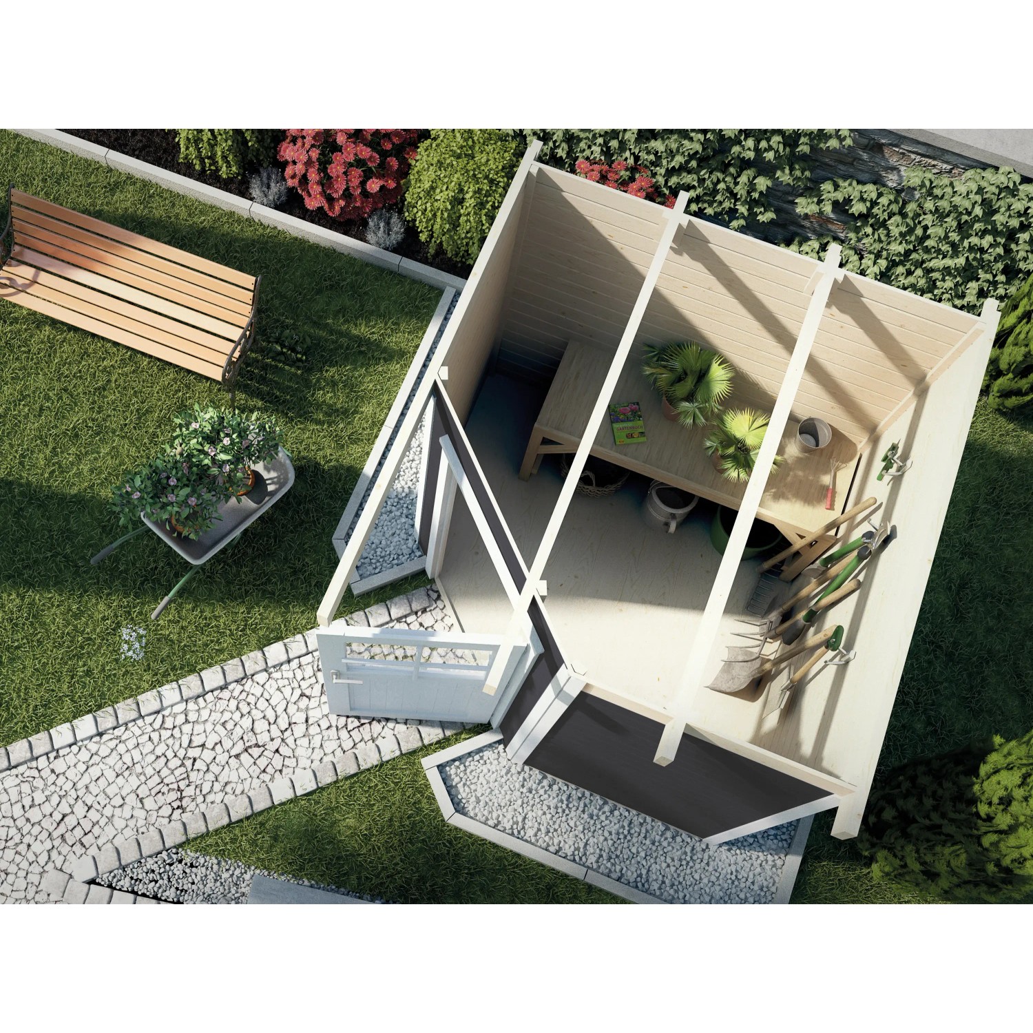 Das Weka Gartenhaus ist eine raffinierte Lösung für Gartenecken zum Verstauen von Gartenutensilien aller Art. Der Eckeingang macht es dabei zu einem kleinen Raumwunder.