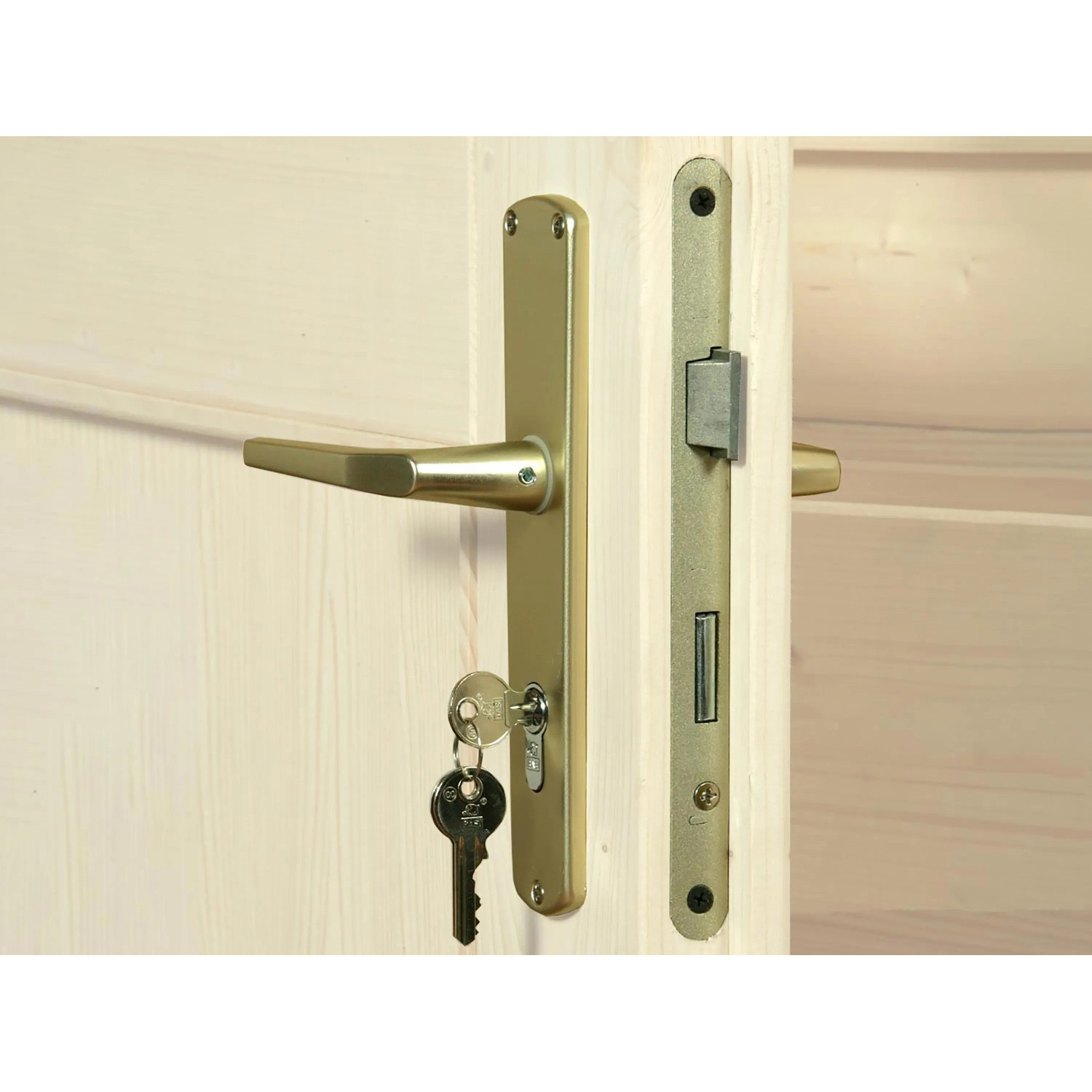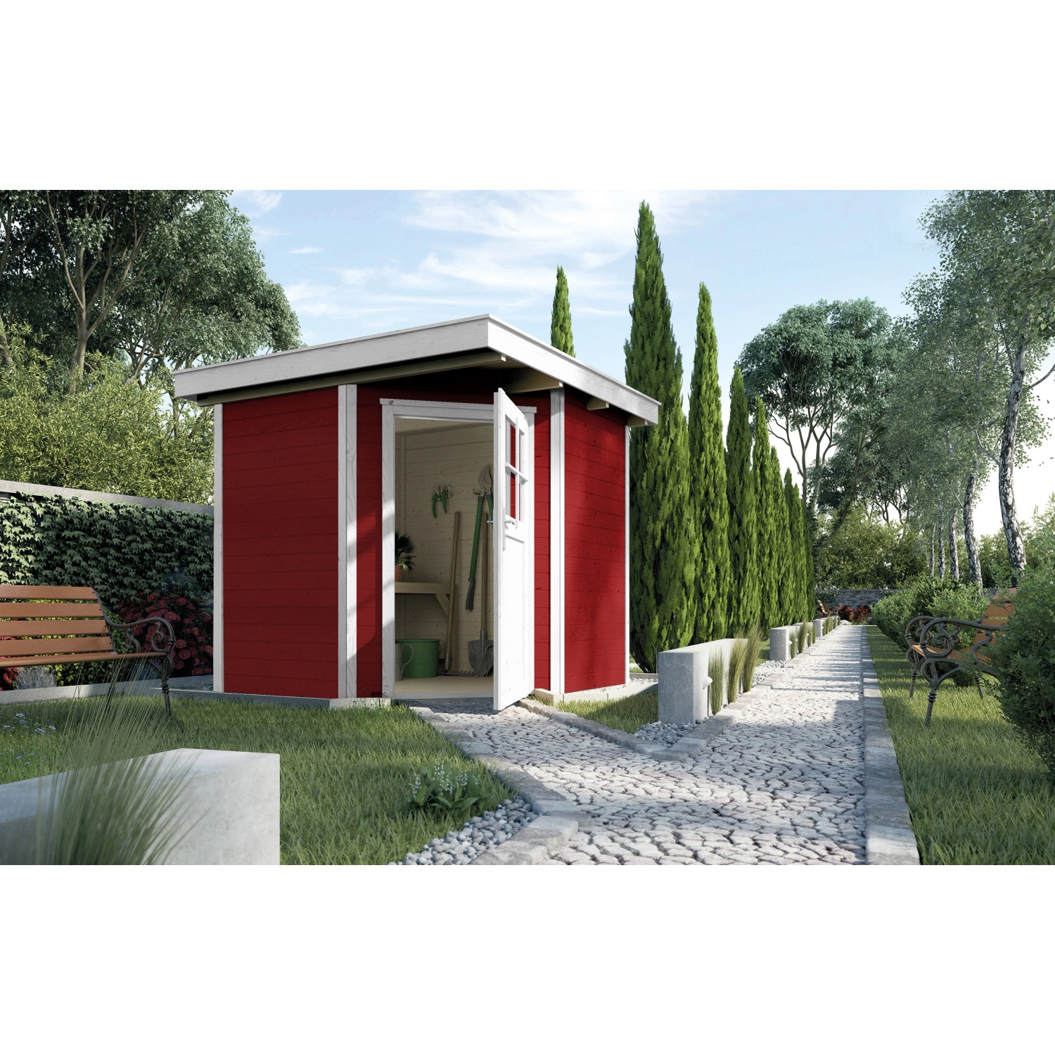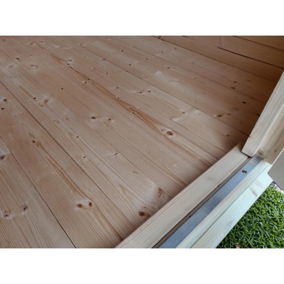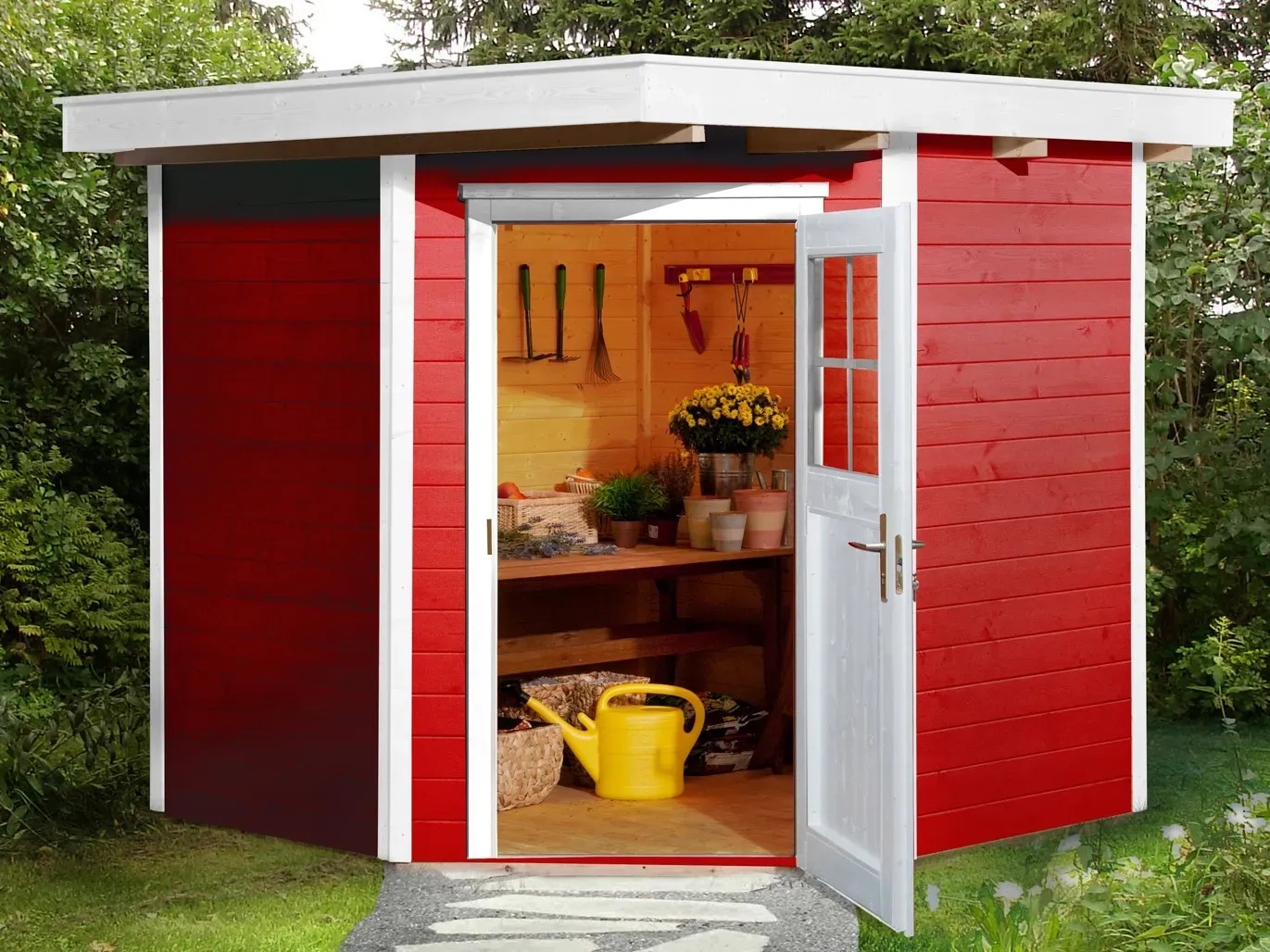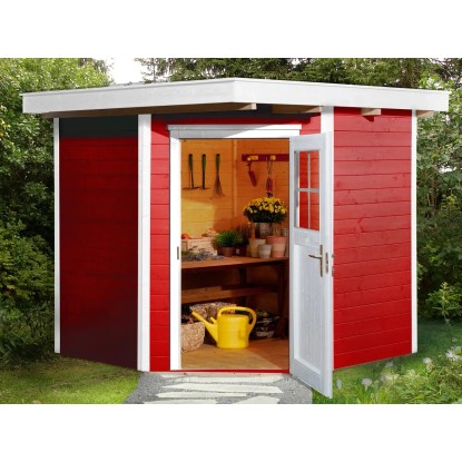 Das Blockbohlenhaus Angolo ist eine raffinierte Lösung für Gartenecken zum Verstauen von Gartenutensilien aller Art. Der Eckeingang macht es dabei zu einem kleinen Raumwunder. Das Haus verfügt über ein 16-mm-Massivholz-Flachdach und einen 16-mm-Massivholzboden. Die Wände bestehen aus 21 mm starken Blockbohlen und werden über ein modernes Schraubsystem miteinander verbunden. Aussen ist das Haus mit einer roten Wetterschutzfarbe gestrichen, Türen und Leisten sind weiss abgesetzt, der Innenraum ist naturbelassen.