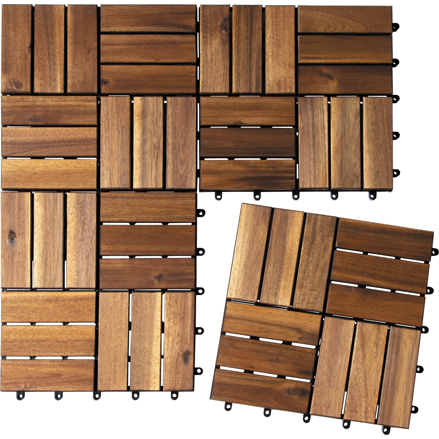 Dank des Klick-Systems lassen sich diese Terrassenfliesen einfach verlegen. Eine Fliese ist mit 12 Leisten aus Akazien bestückt. Das Trägermaterial besteht aus teilweise recyceltem Kunststoff.