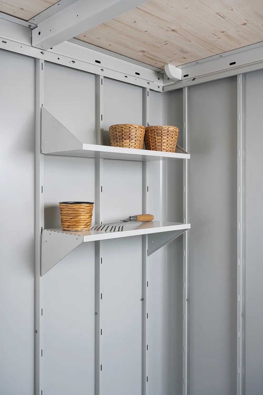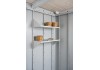 Il set di scaffali trasforma la tua casetta da giardino Biohort o il tuo armadio per attrezzi Biohort in un magazzino di minuteria ed è posizionabile a piacere. È facile da installare successivamente e resiste a carichi fino a 15 kg per ripiano.