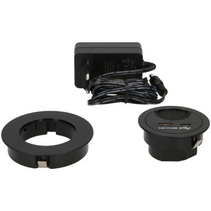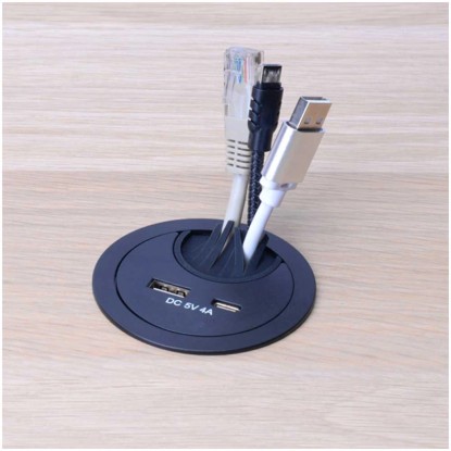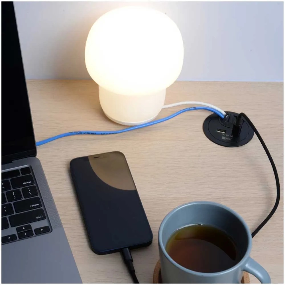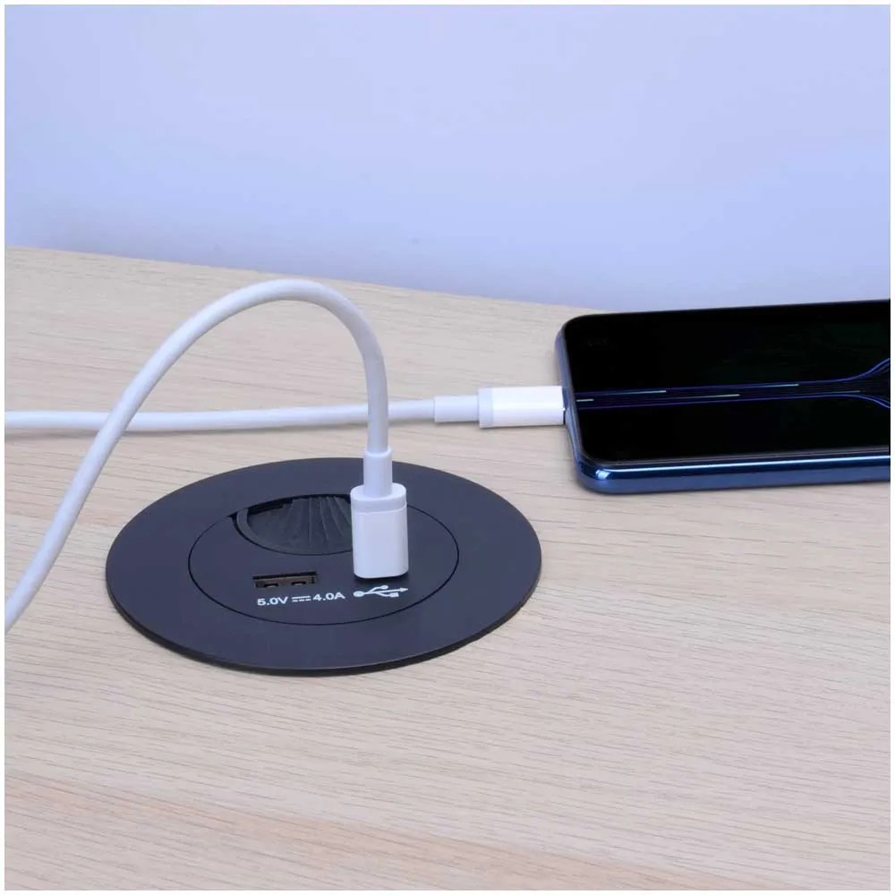 Diese schwarze Kabeldurchführung mit integrierten USB-A- und -C-Anschlüssen eignet sich für eine einfache Elektrifizierung und Ordnung des Arbeitsplatzes im Büro oder Homeoffice. Unter dem Tisch angeschlossene Kabel können durch die Staubschutzbürste diskret auf die Arbeitsfläche geführt werden, ohne auf dem Tisch herumzuliegen. Zusätzlich können elektronische Geräte mittels den USB-Anschlüssen direkt aufgeladen werden. Die Stromversorgung wird durch ein Netzgerät mit einem Anschlusskabel mit einer Länge von 1,5 m gewährleistet.
