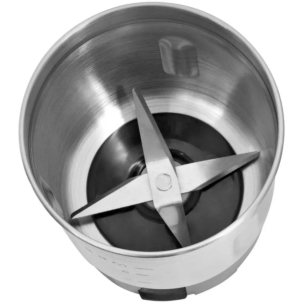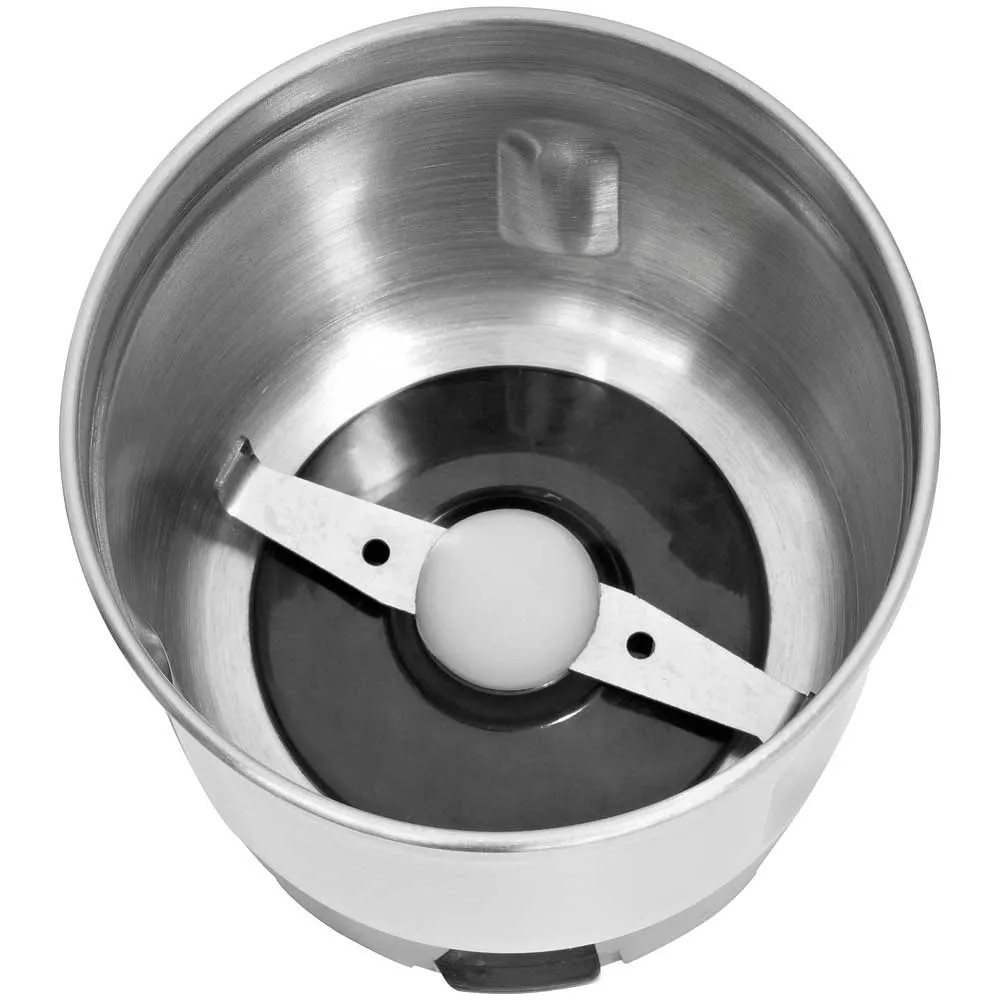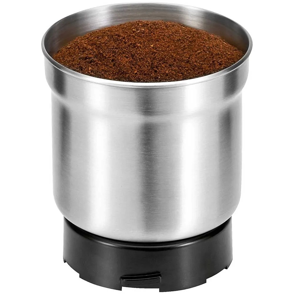 Dieses Gerät dient sowohl als Kaffeeschlagwerk als auch als Zerkleinerer. Das Gehäuse besteht aus Edelstahl. Es gibt zwei extra grosse Edelstahlbehälter mit einem Fassungsvermögen von je 350 ml, was etwa 75 g Kaffeebohnen entspricht. Die Zweifach-Schlagmesser für Kaffeebohnen bestehen aus Edelstahl, für Gewürze, Nüsse oder Kräuter sind Vierfach-Hackmesser vorhanden. Der Deckel ist transparent. Das Gerät verfügt über einen kräftigen Motor mit 200 W, eine Sicherheitsschaltung, sodass der Betrieb nur mit aufgesetztem Deckel möglich ist, und auch eine Sicherheitstaste für den Impulsbetrieb. Der Mahlgrad ist durch die Länge der Betriebsdauer wählbar. Eine Kabelaufwicklung ist ebenfalls vorhanden.