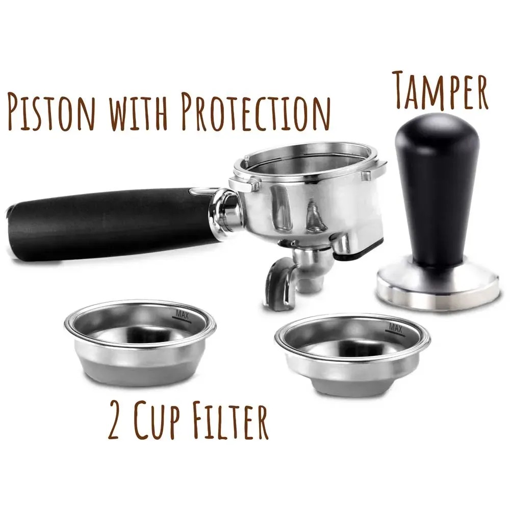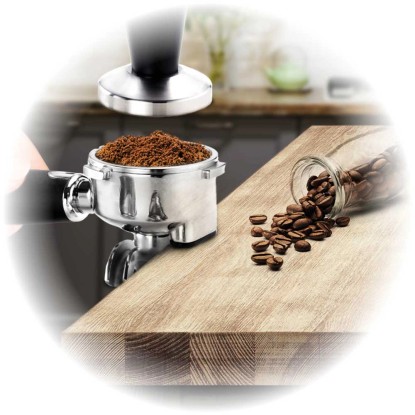 Die Espressomaschine ist in drei angesagten Farben erhältlich. Im Lieferumfang sind verschiedene Filtereinsätze und ein Tamper enthalten.