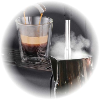 Das integrierte Dual-Boiler-System reduziert die Aufheizzeiten während der Vorgänge. Bei der Zubereitung von Espresso mit 20 bar Pumpendruck kann gleichzeitig Milch aufgeschäumt oder heisses Wasser abgezapft werden. Kaffee- und Tee-Geniesser werden somit praktisch simultan bedient. Bei Nichtgebrauch wechselt die Maschine automatisch in den Standby-Modus.
